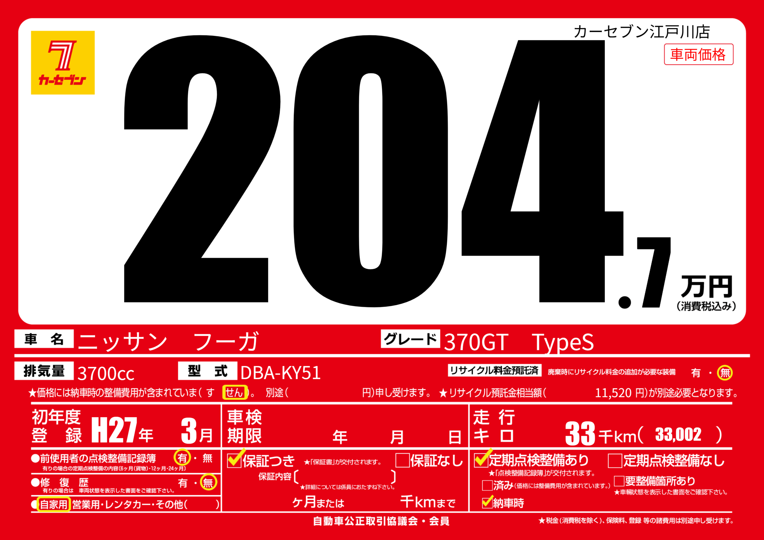 | 車名 | ニッサン フーガ | グレード ミッション 排気量 |