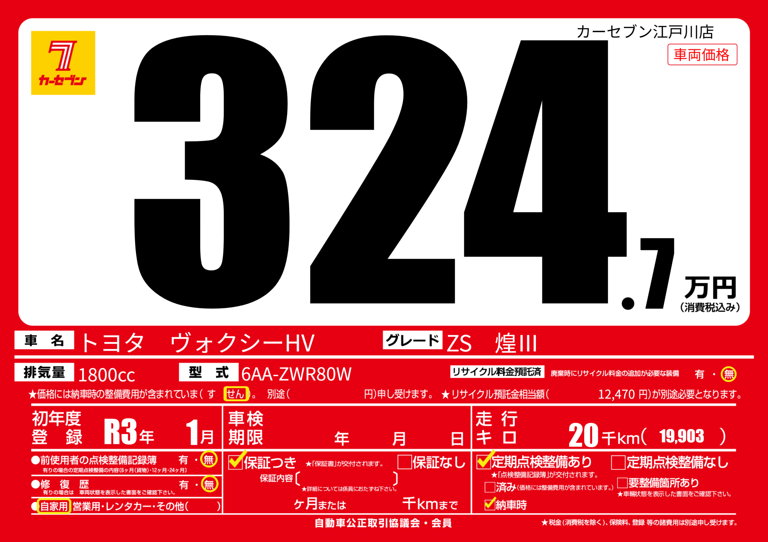 | 車名 | トヨタ ヴォクシーHV | グレード ミッション 排気量 |