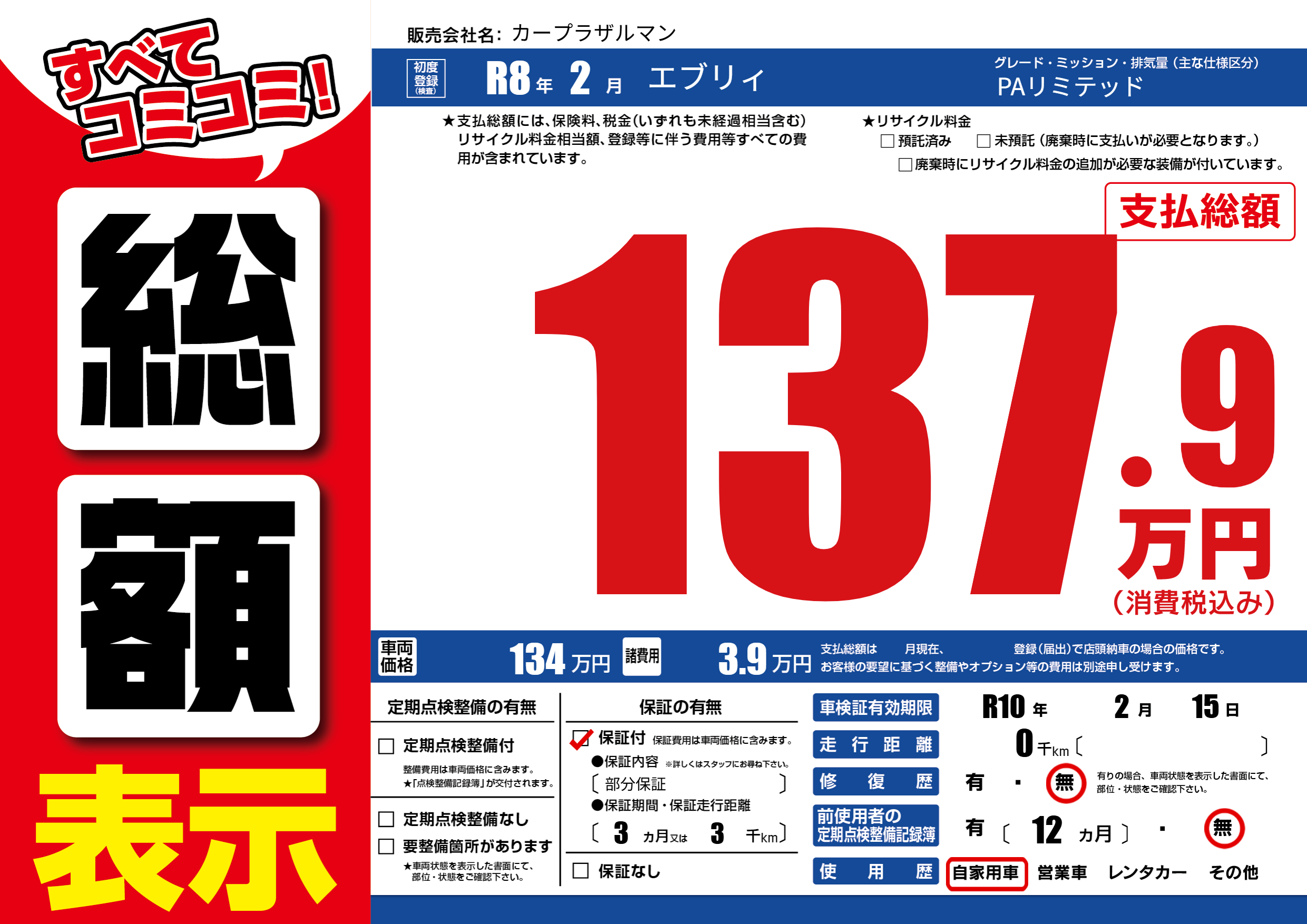 | 車名 | エブリィ | グレード ミッション 排気量 |
