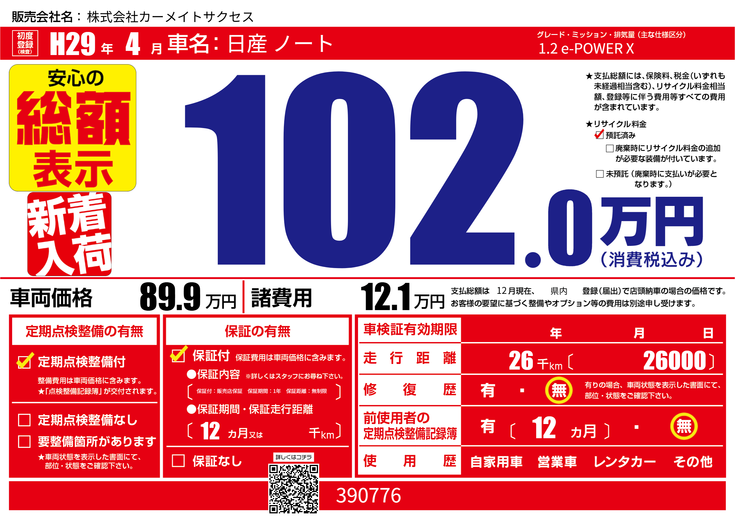 保証なし 保証内容(保証付:販売店保証 保証期間:1年 保証距離:無制限) 12ヶ月または()千kmまで |