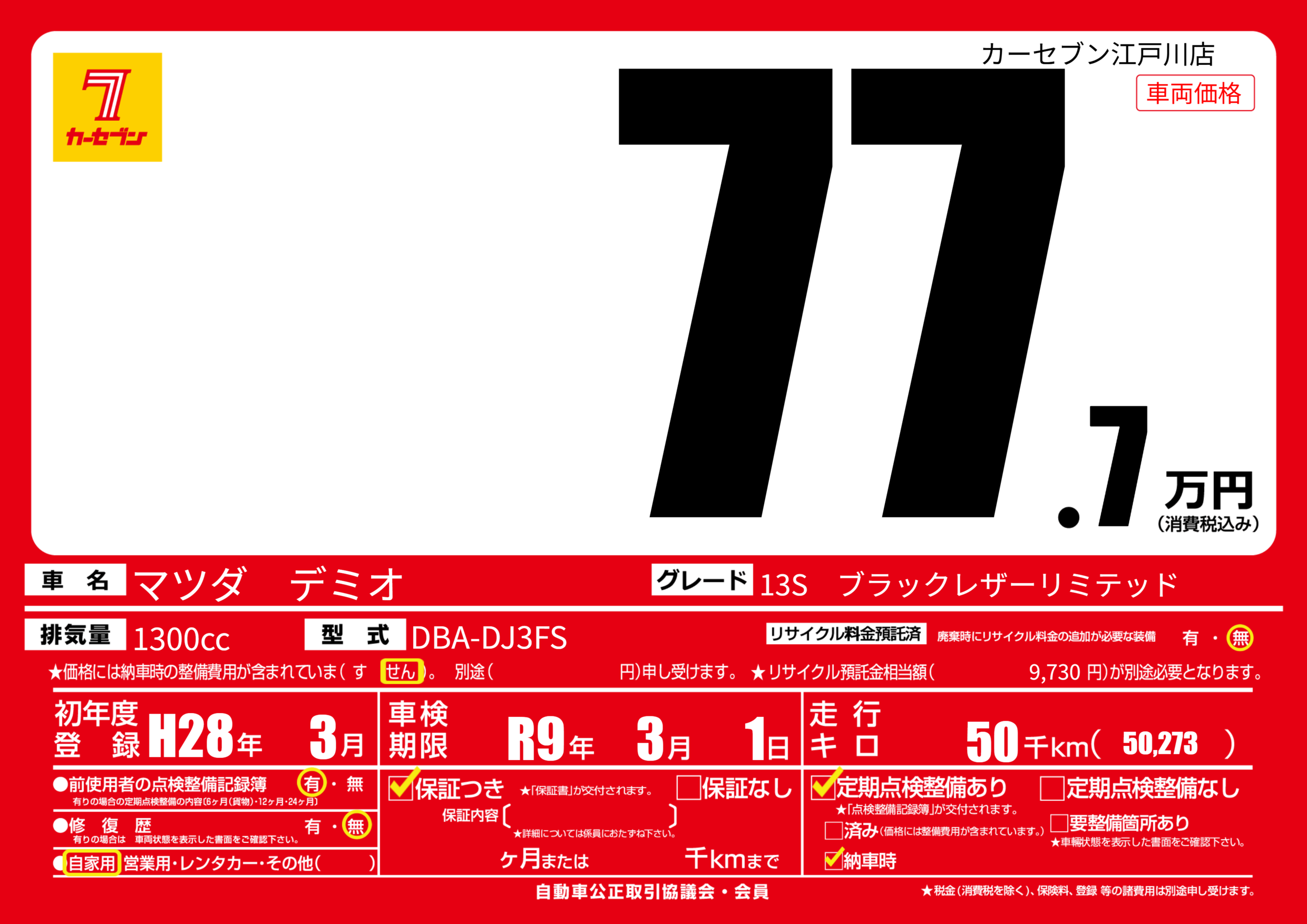 | 走行キロ | 5万km | 初年度登録 | H28年3月 |