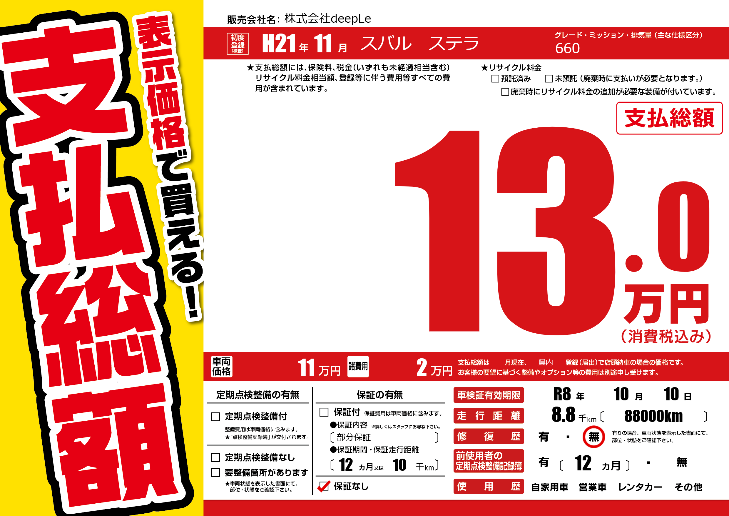 | 車名 | スバル ステラ | グレード ミッション 排気量 |