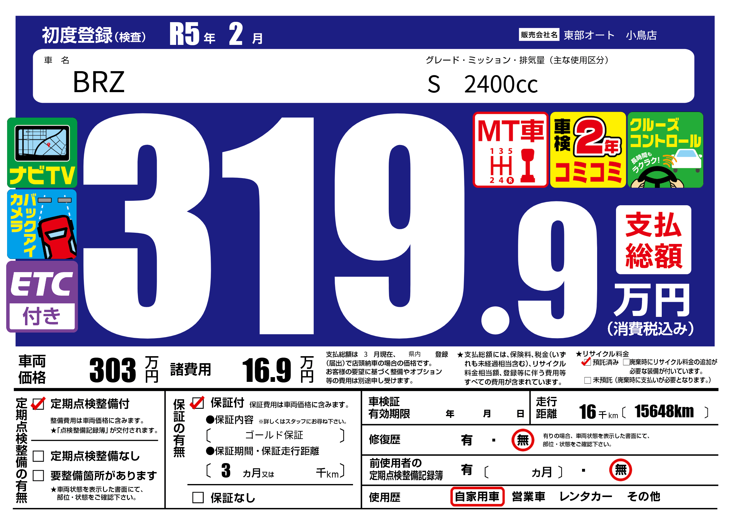 | 車名 | BRZ | グレード ミッション 排気量 |