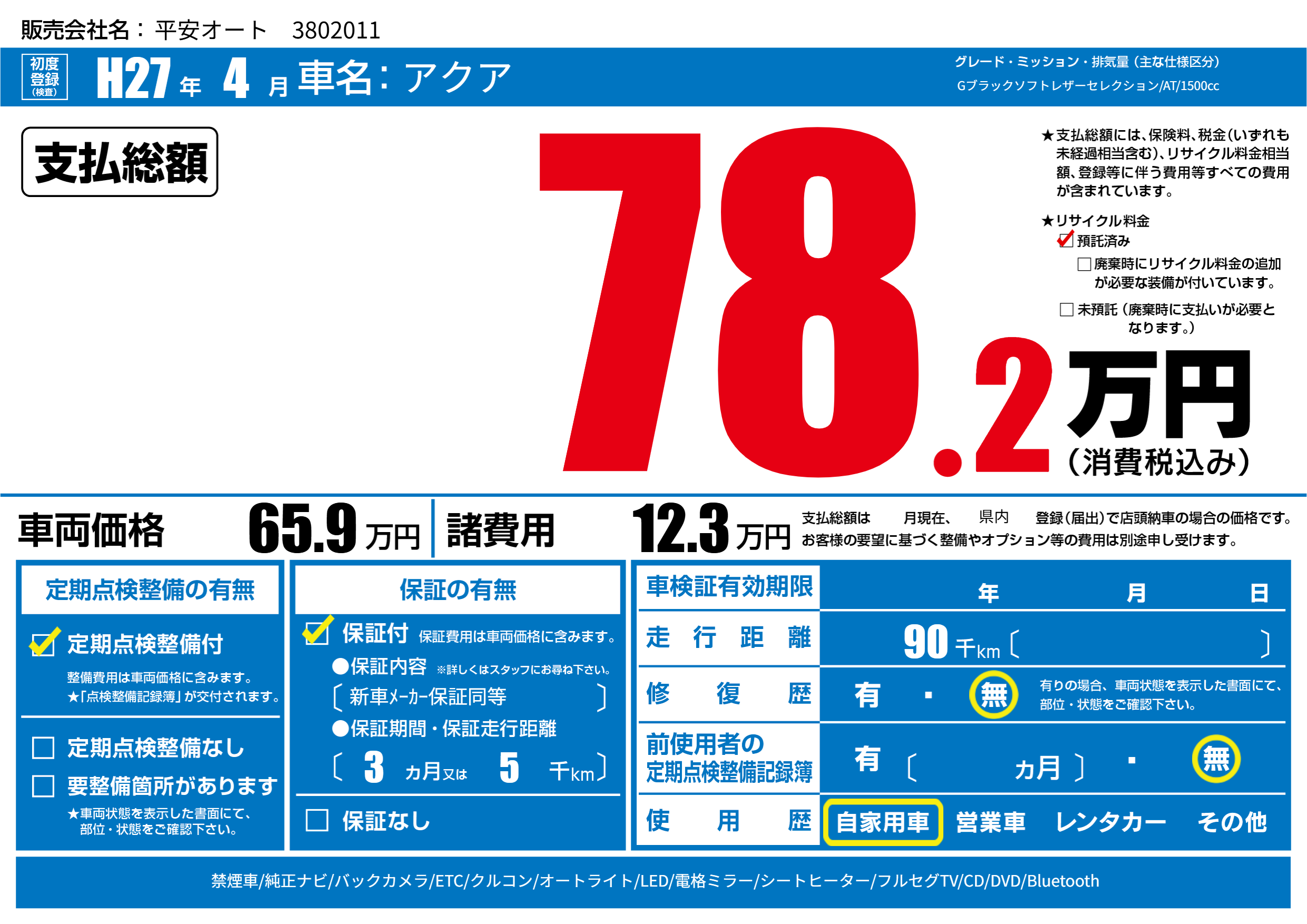 | 走行キロ | 9万km | 初年度登録 | H27年4月 |