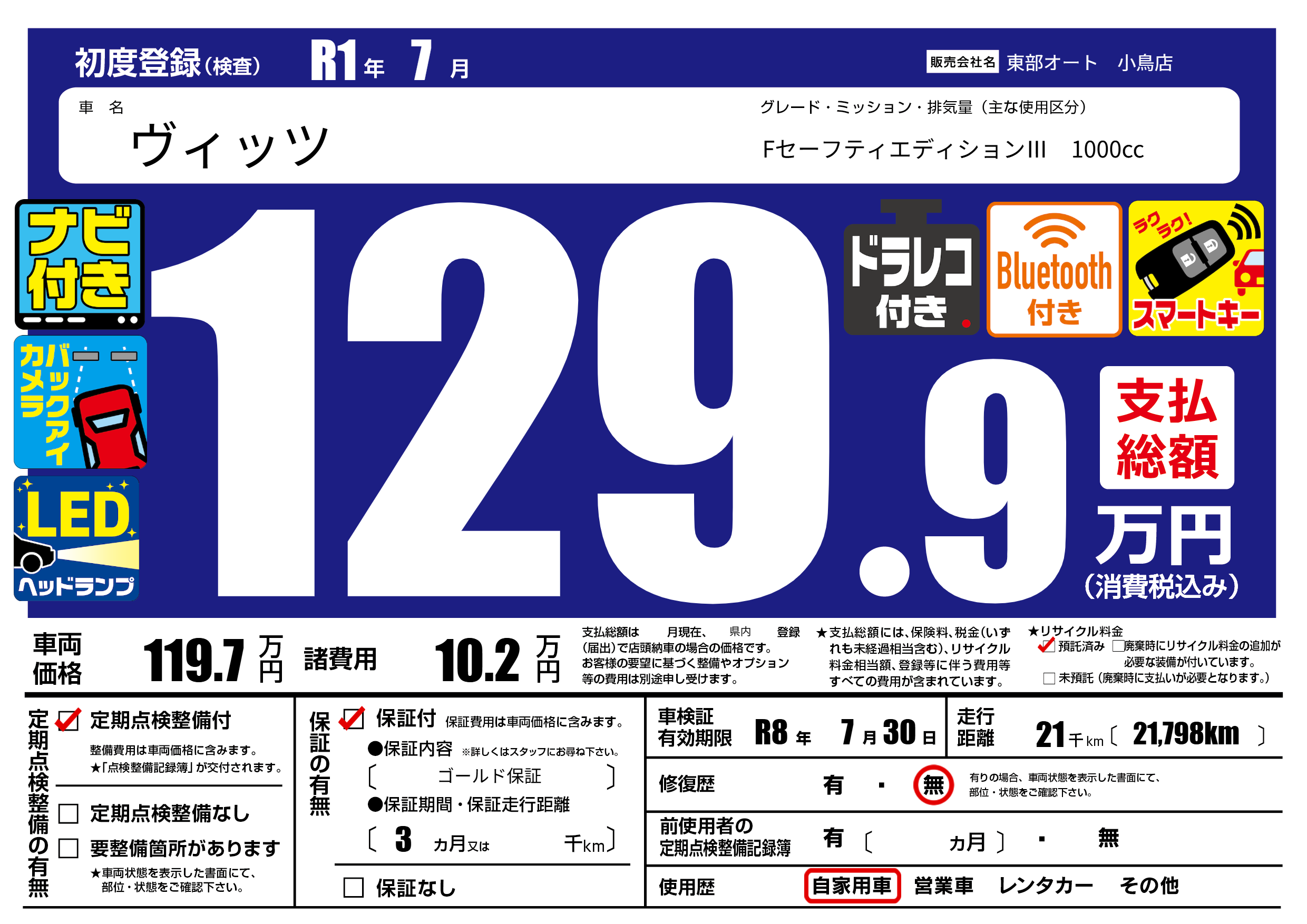 | 走行キロ | 2.1万km | 初年度登録 | R1年7月 |