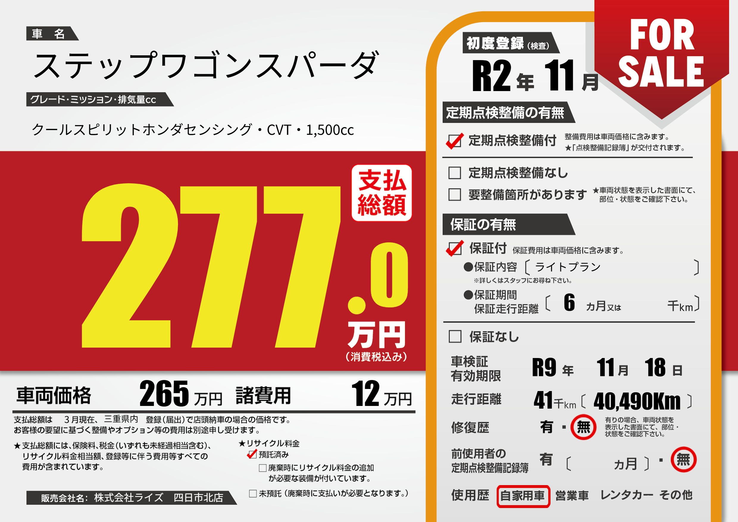 | 車検制限 | R9年 11月 18日 | ||