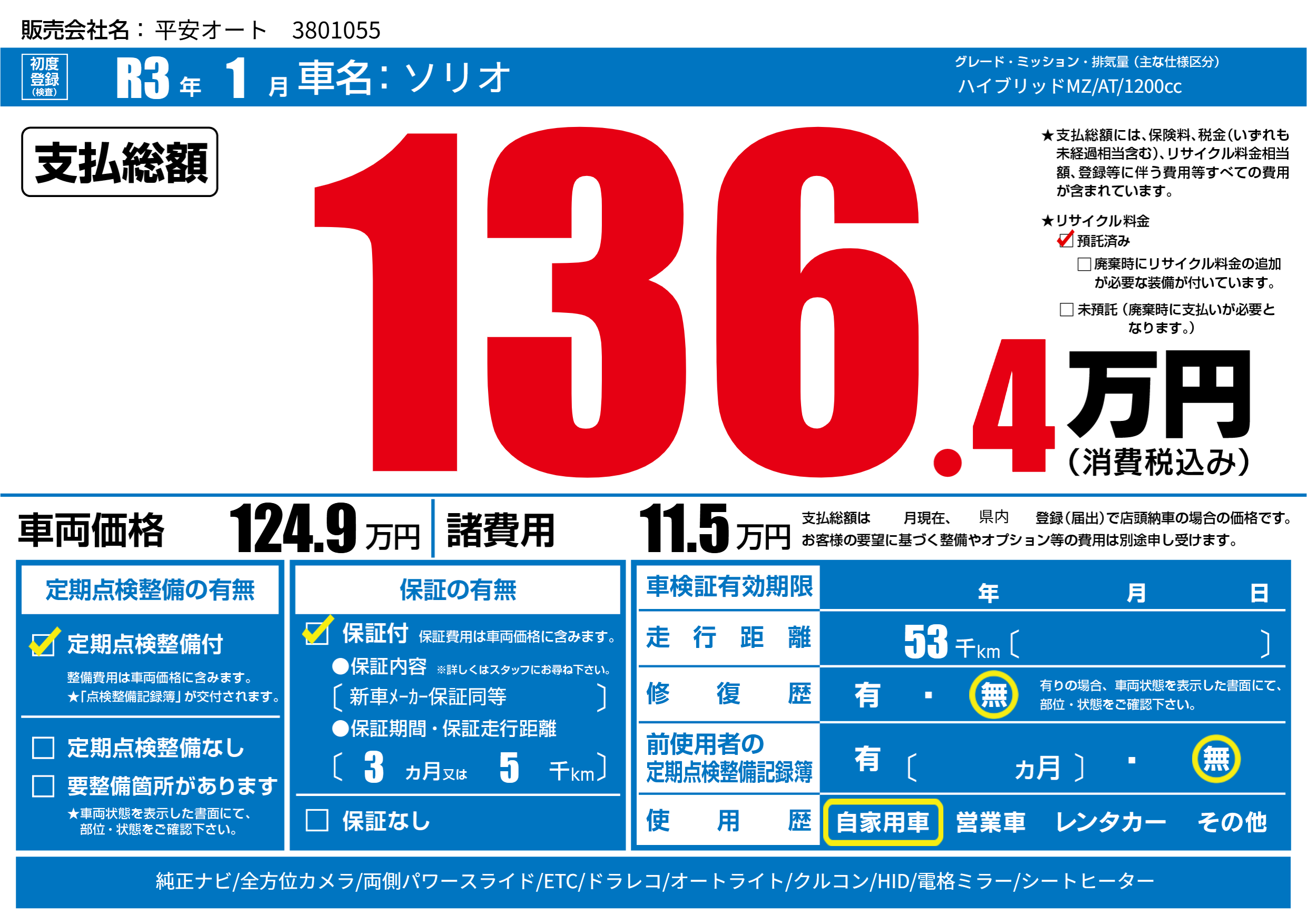 | 車名 | ソリオ | グレード ミッション 排気量 |