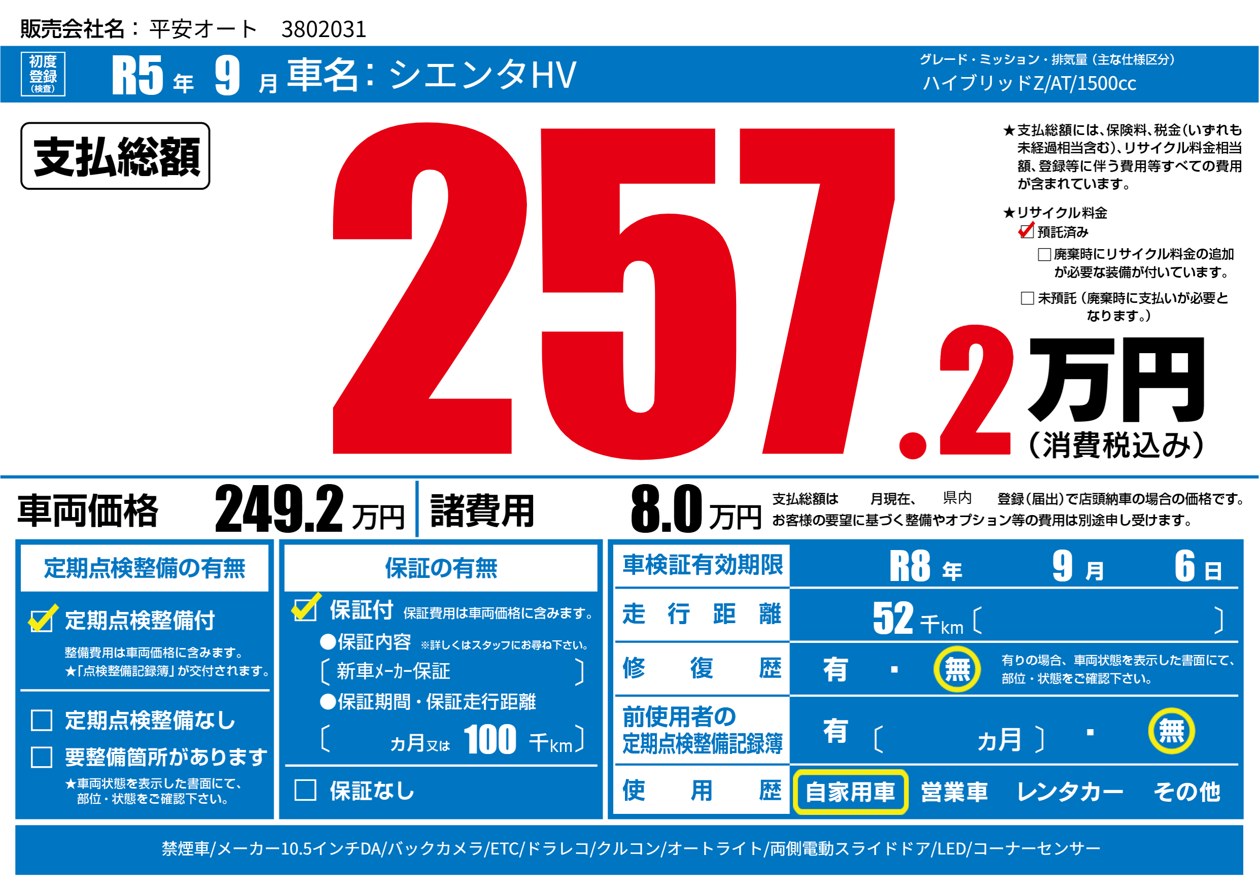 | 車名 | シエンタHV | グレード ミッション 排気量 |