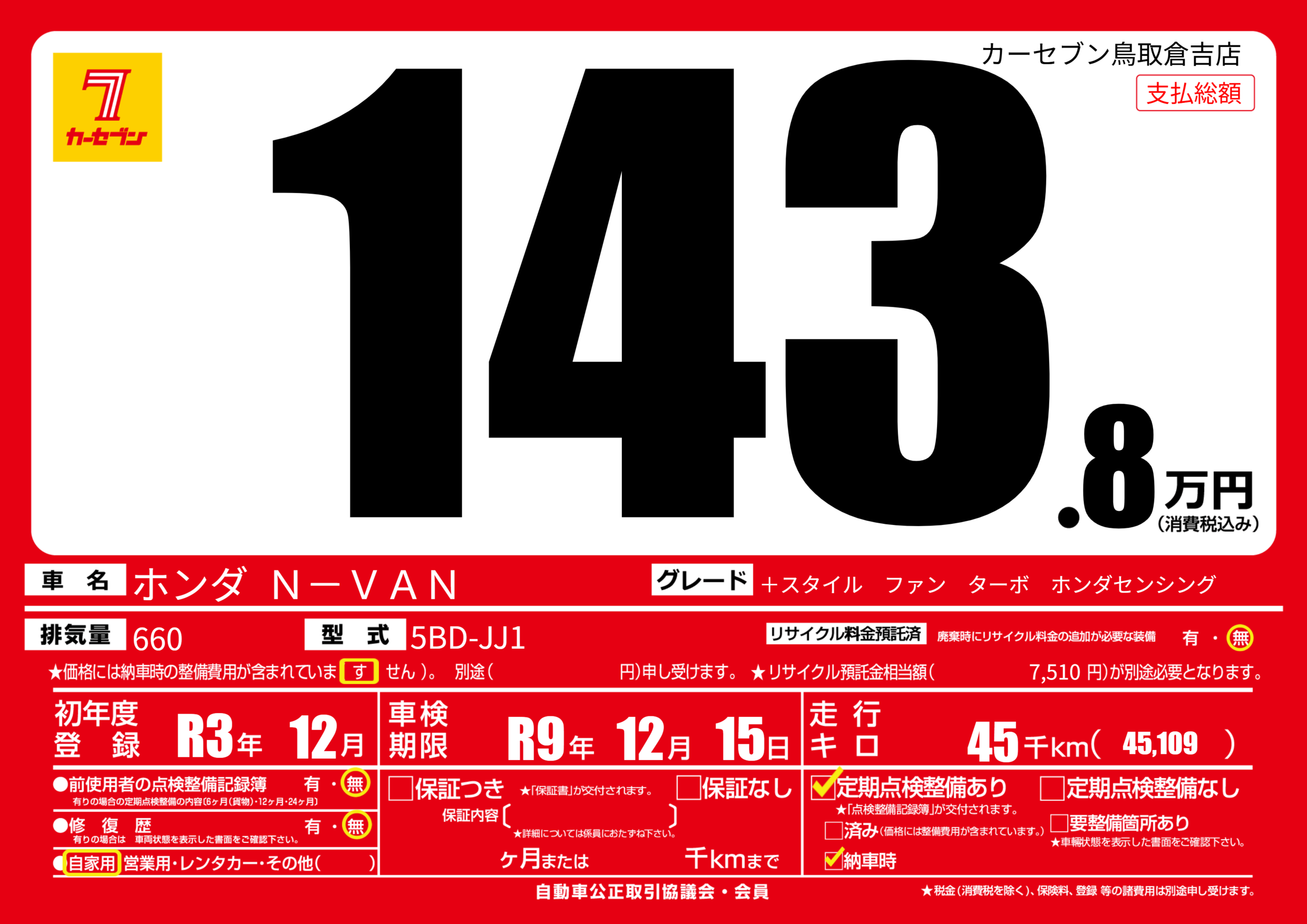 | 車検制限 | R9年 12月 15日 | ||