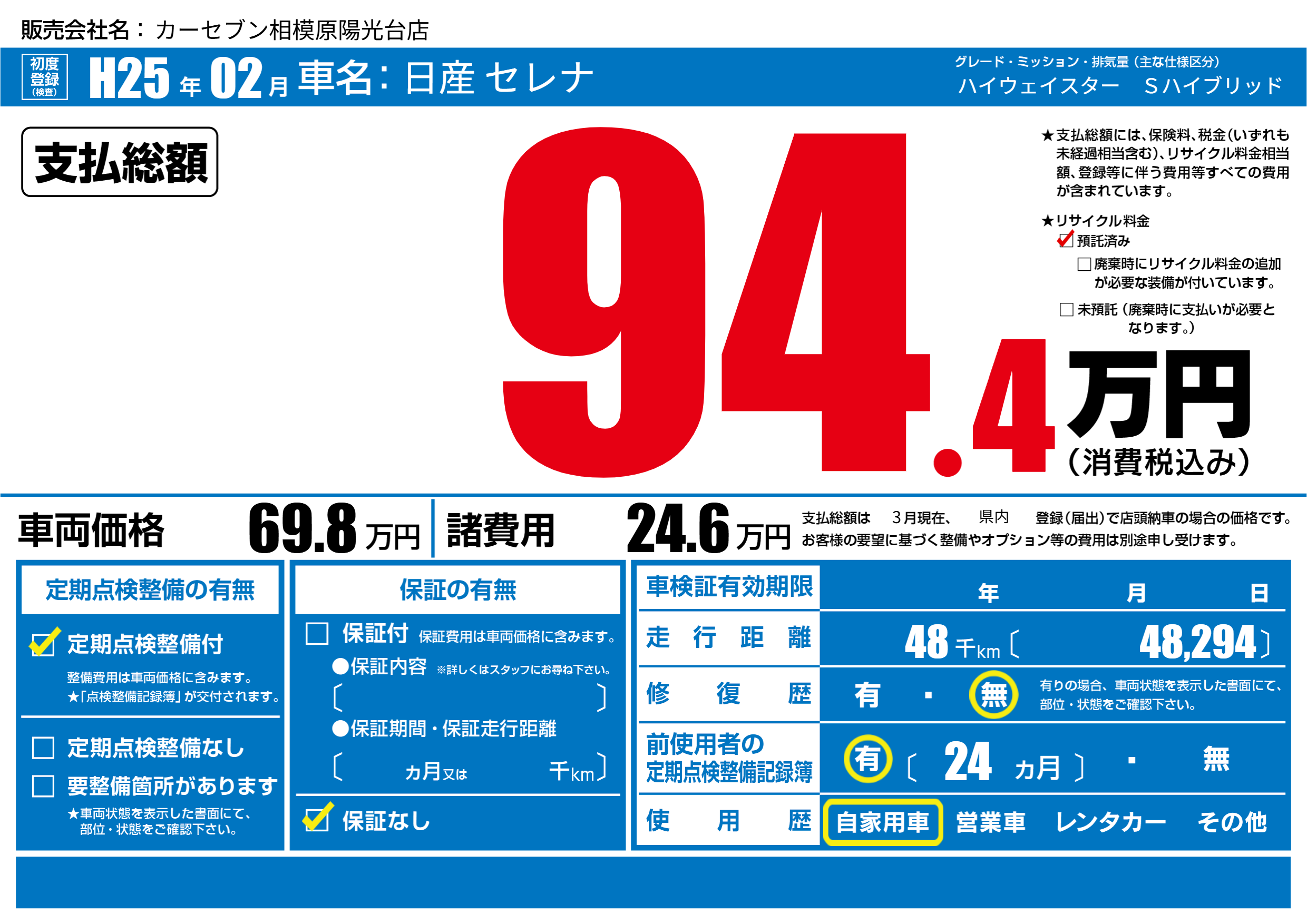 | 走行キロ | 4.8万km | 初年度登録 | H25年02月 |