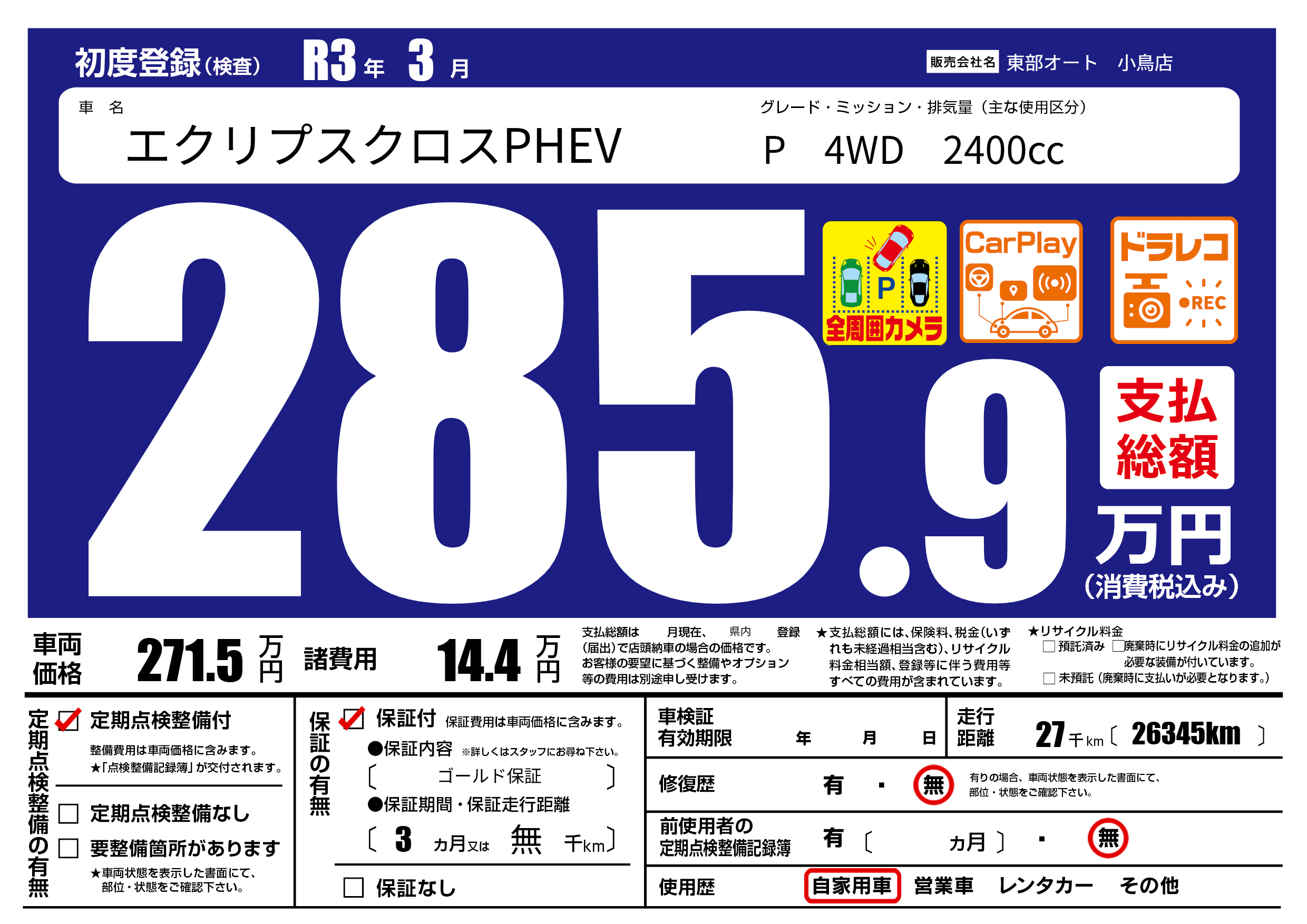 | 走行キロ | 2.7万km | 初年度登録 | R3年3月 |