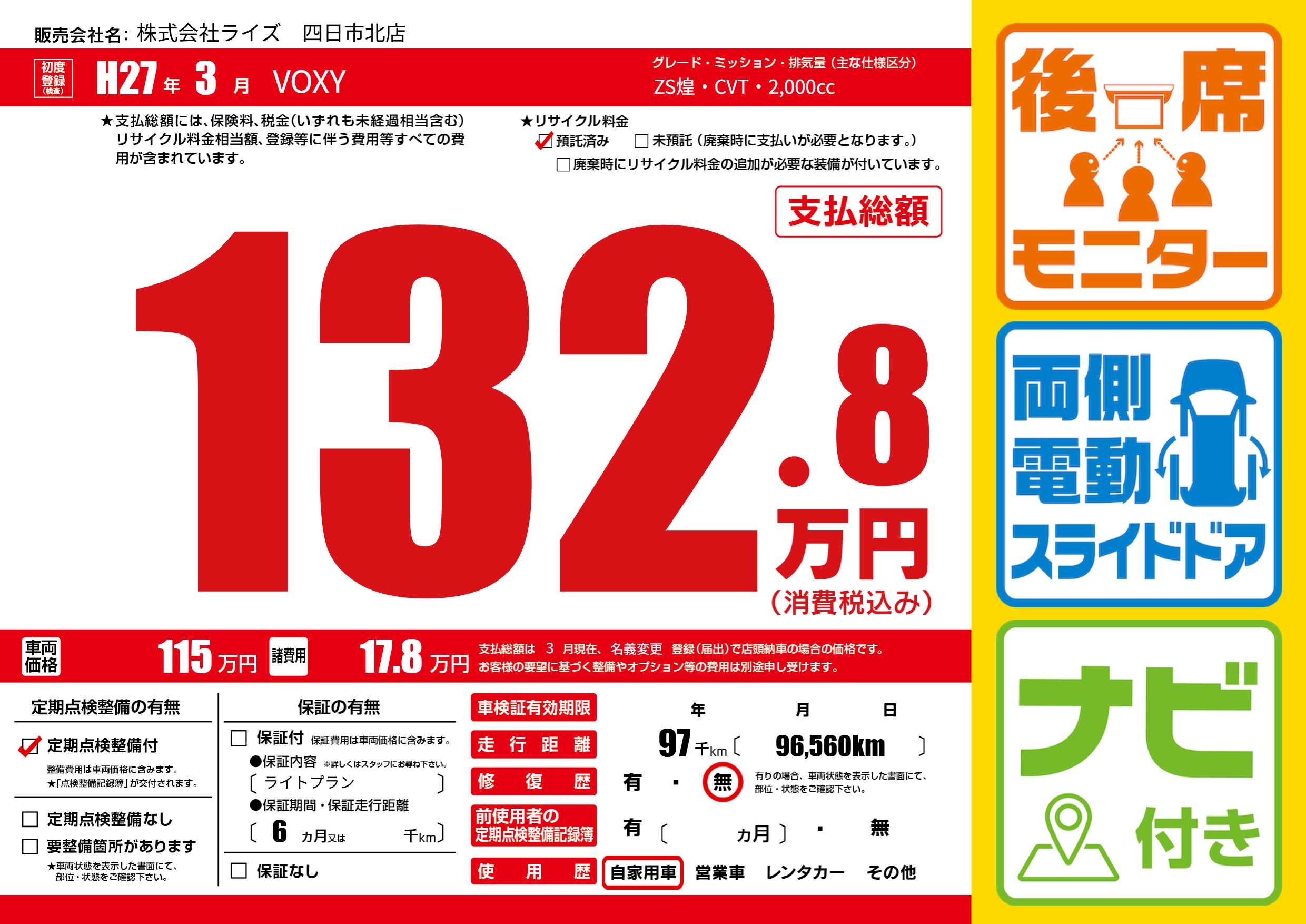 | 走行キロ | 9.7万km | 初年度登録 | H27年3月 |