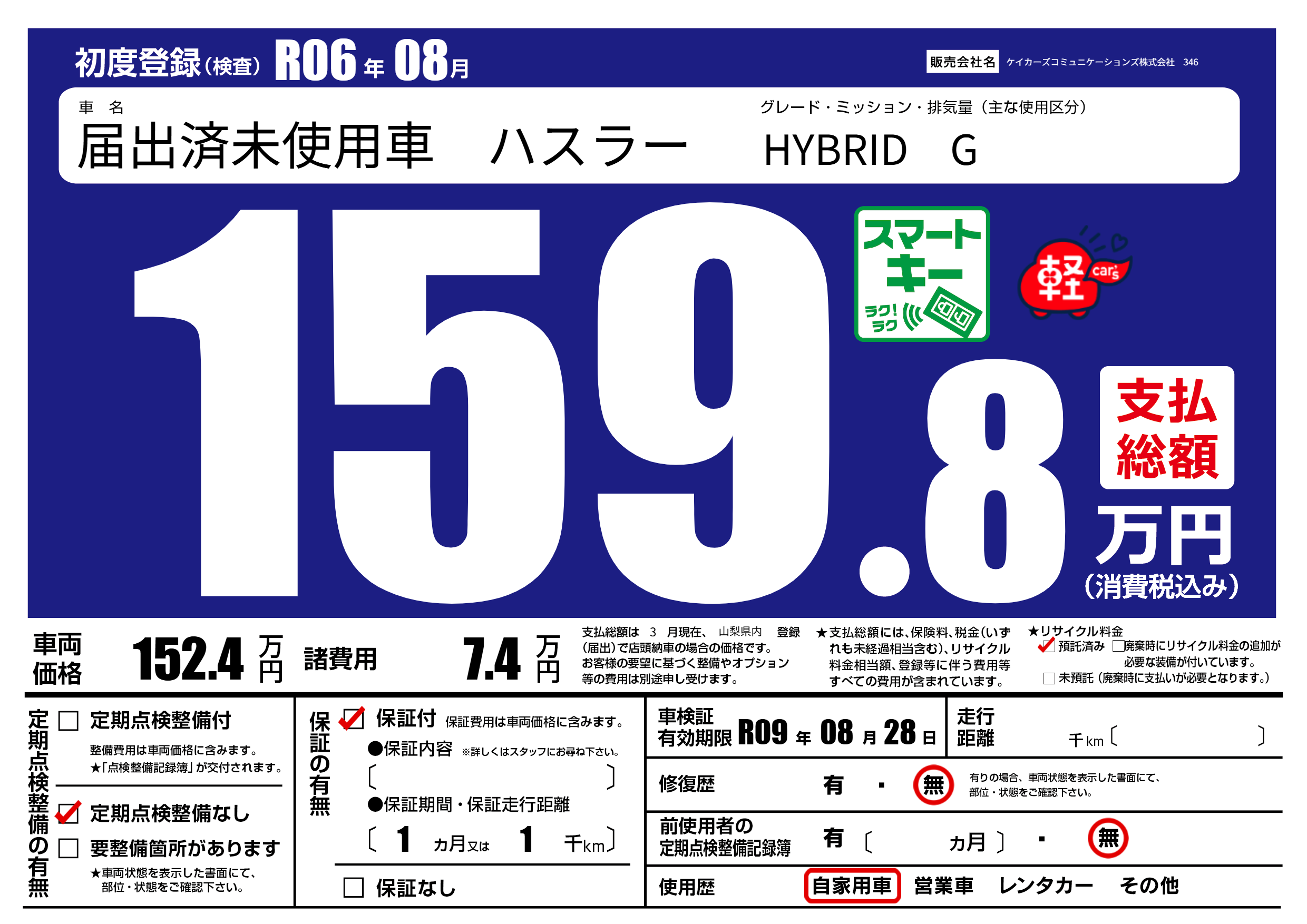 | 走行キロ | - | 初年度登録 | R06年08月 |