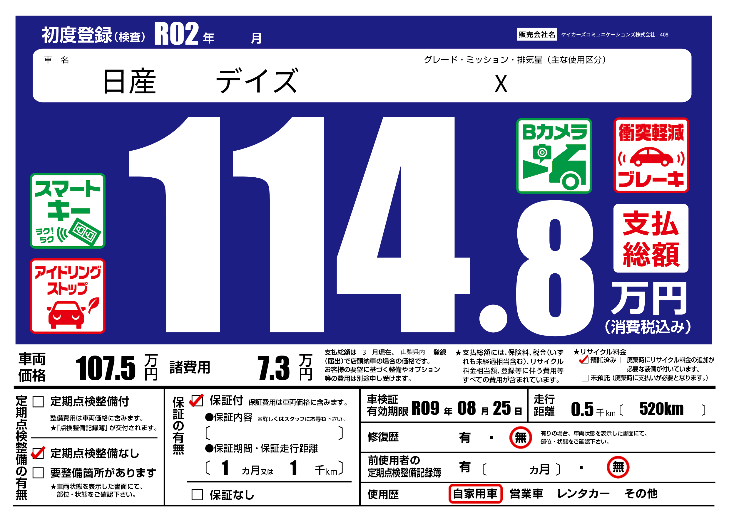 | 車名 | 日産 デイズ | グレード ミッション 排気量 |