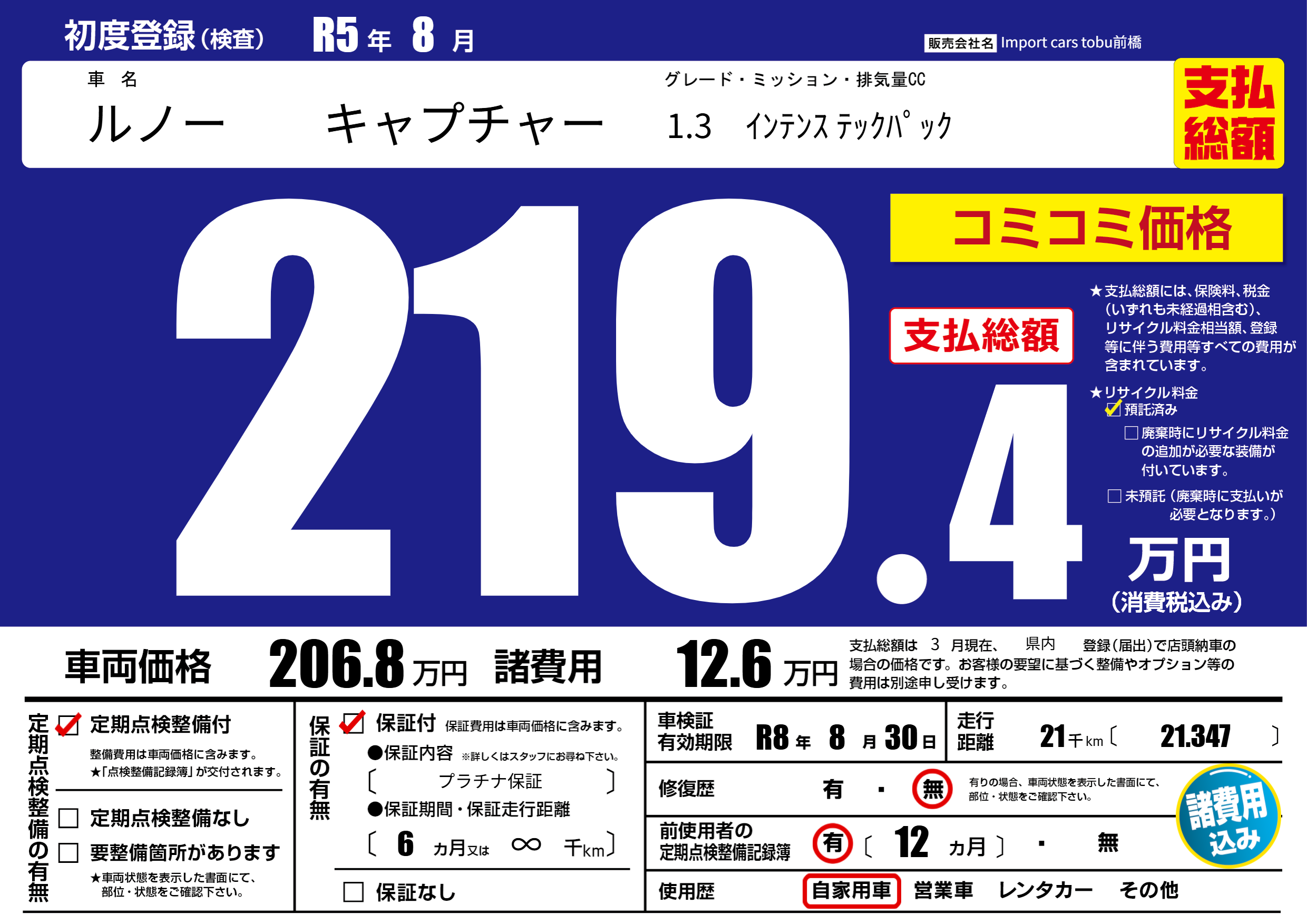 保証付き 保証内容( プラチナ保証) 6ヶ月または(∞)千kmまで |