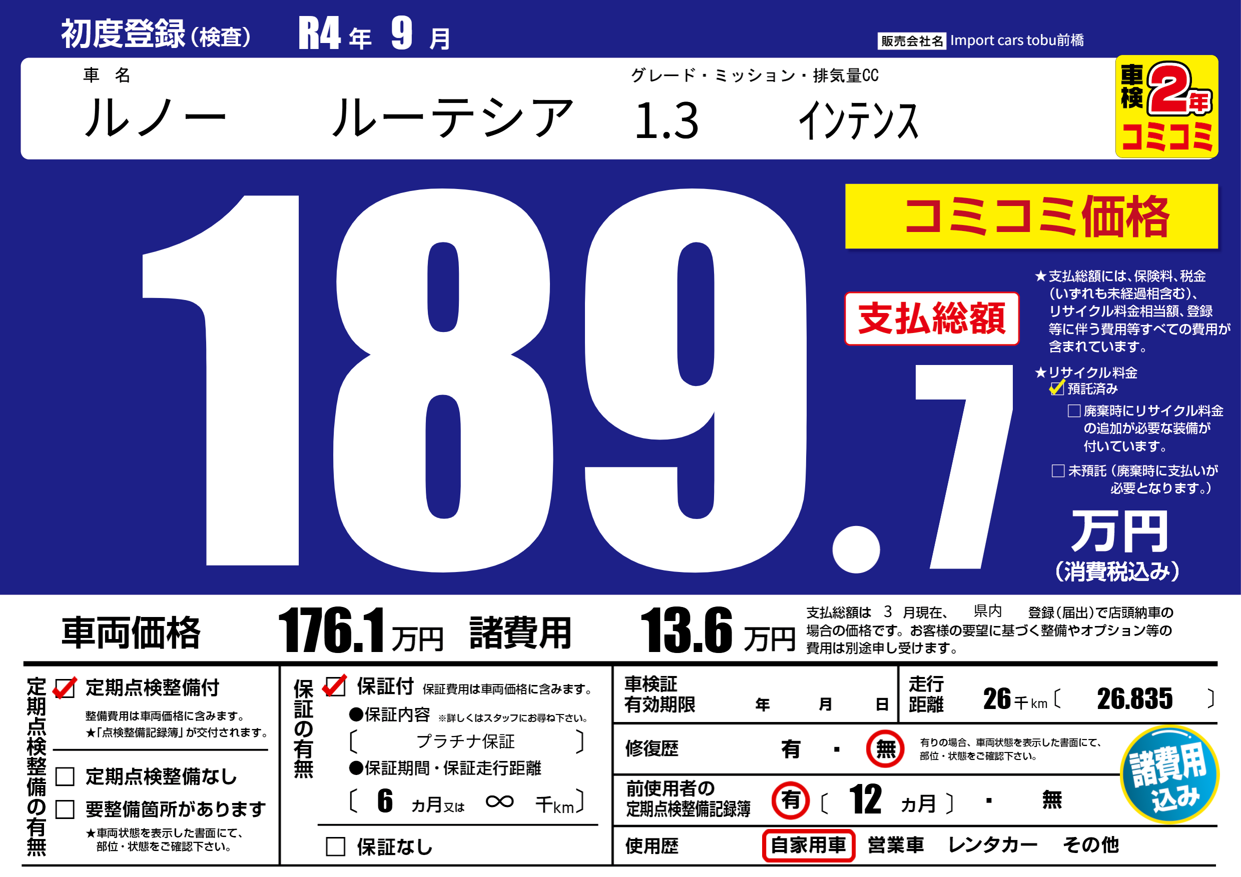 保証付き 保証内容( プラチナ保証) 6ヶ月または(∞)千kmまで |