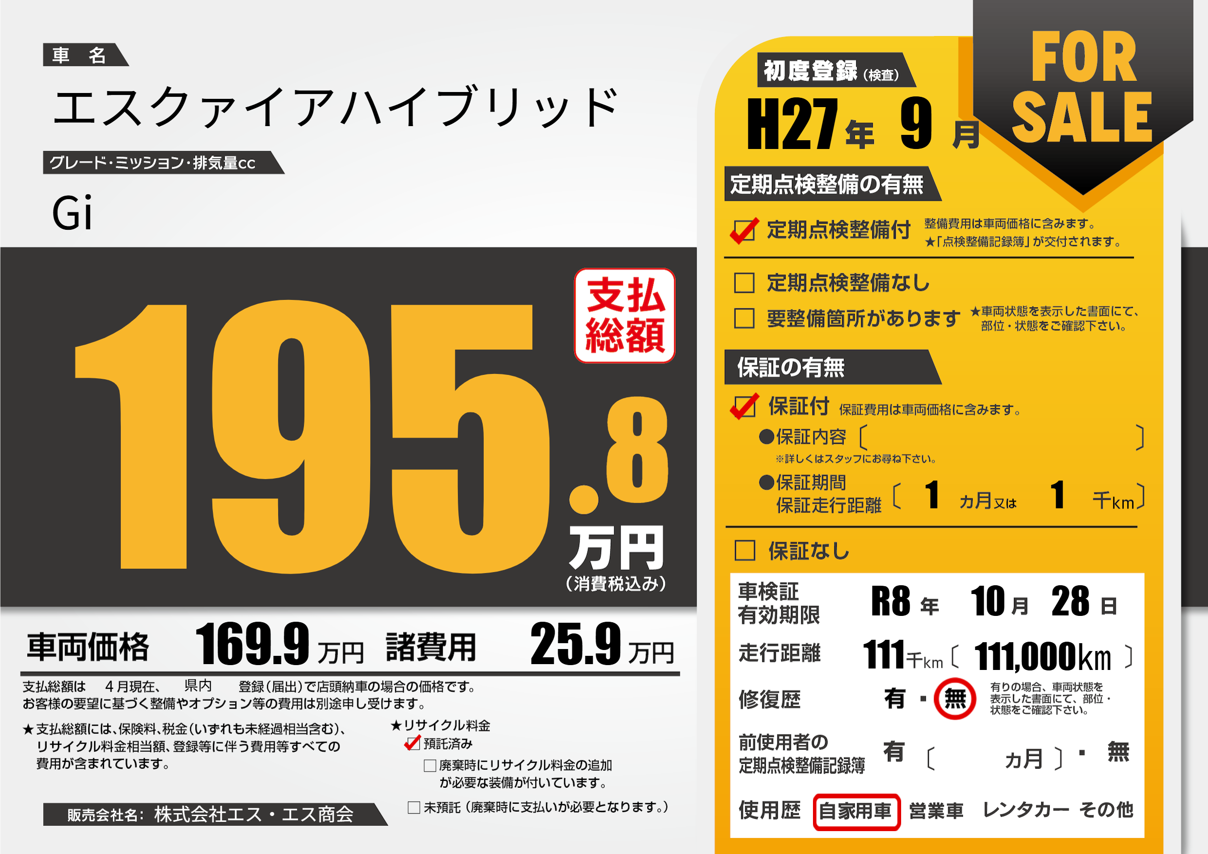 | 走行キロ | 11.1万km | 初年度登録 | H27年9月 |
