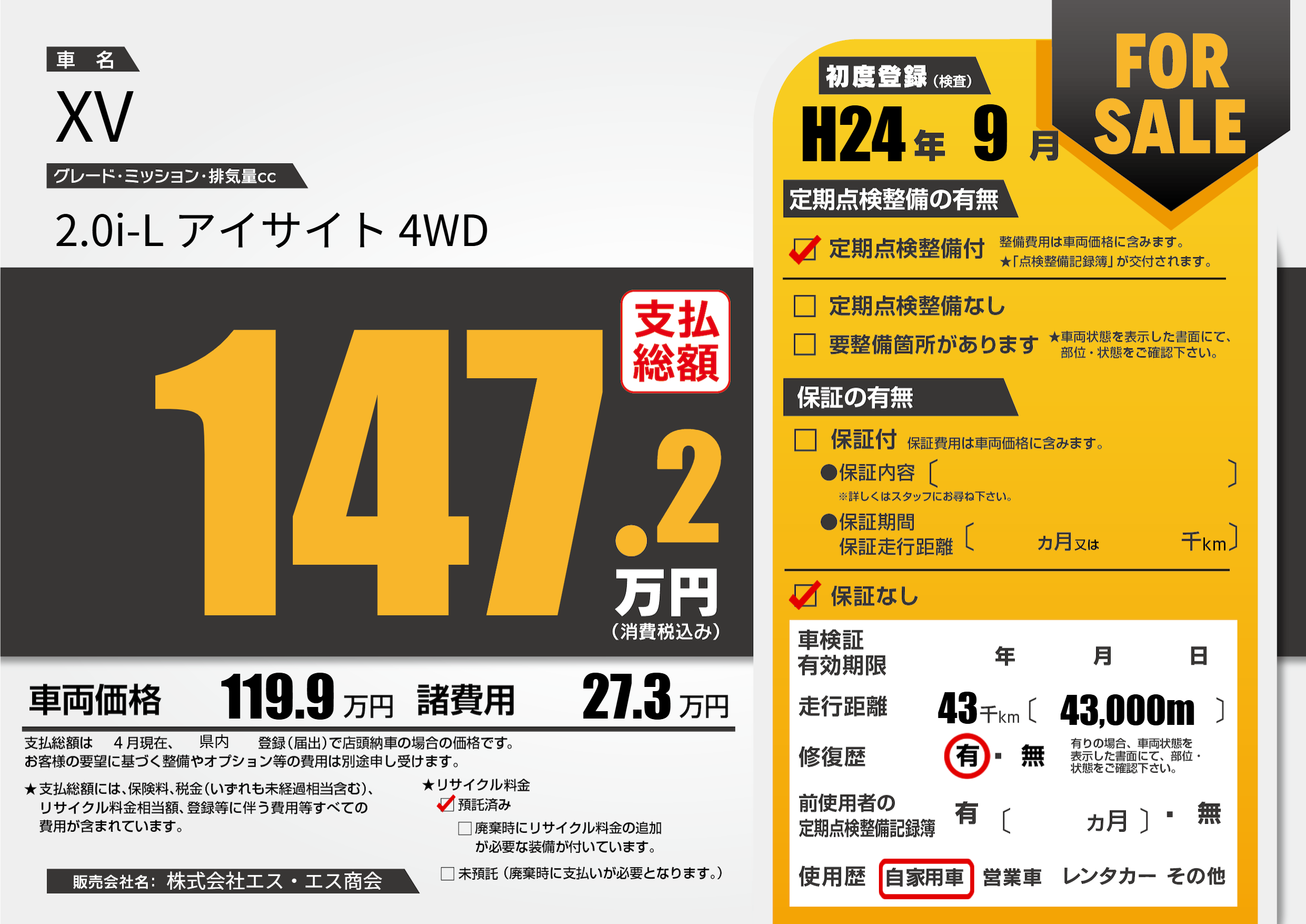 | 走行キロ | 4.3万km | 初年度登録 | H24年9月 |