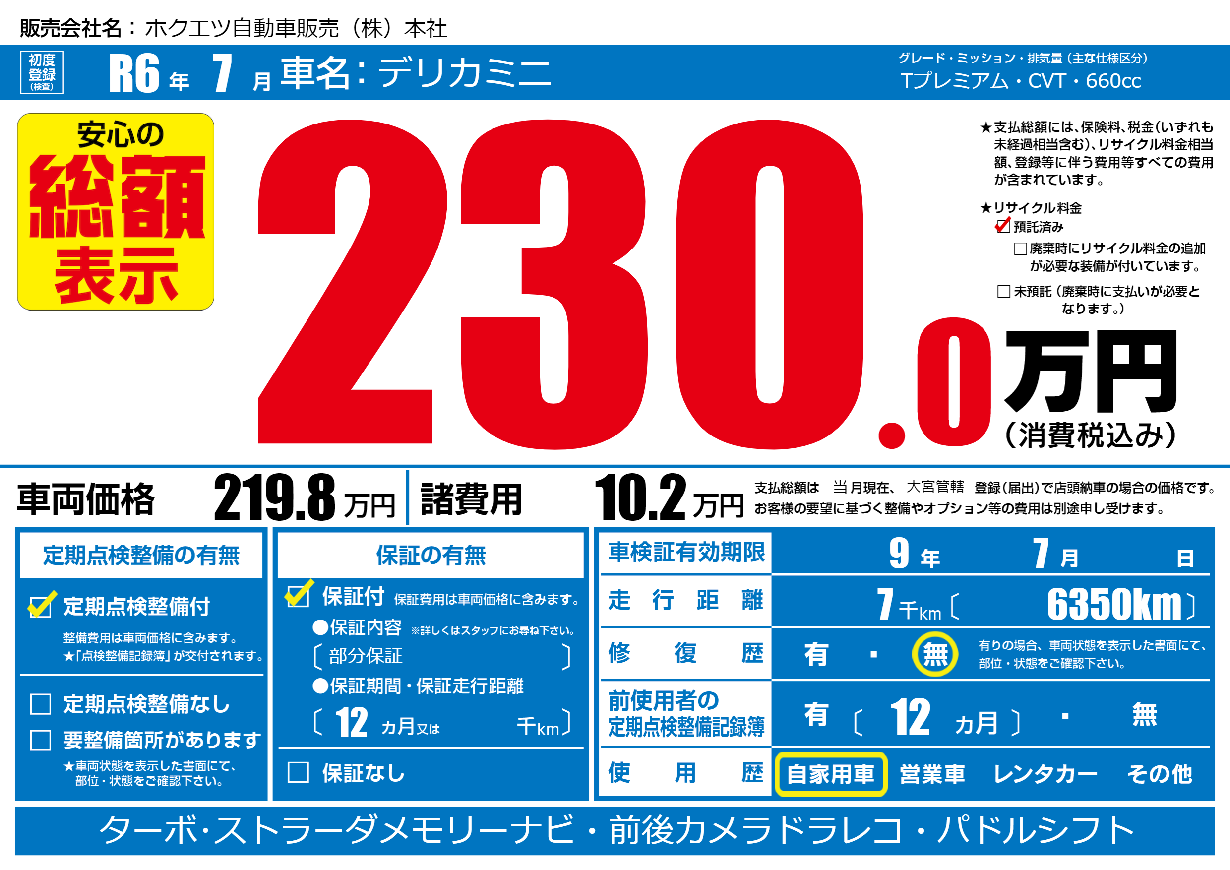 | 走行キロ | 0.7万km | 初年度登録 | R6年7月 |