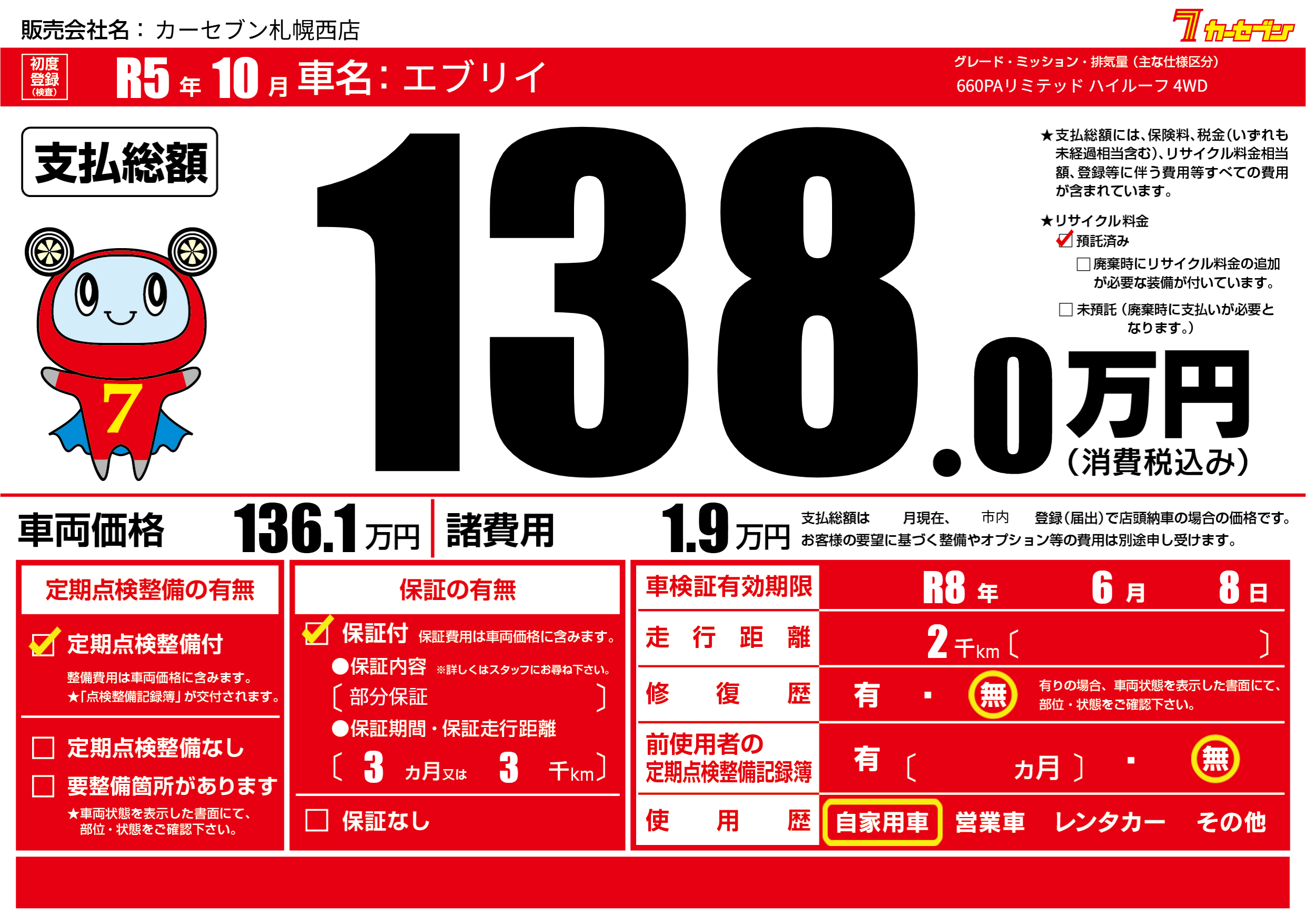 | 車検制限 | R8年 6月 8日 | ||