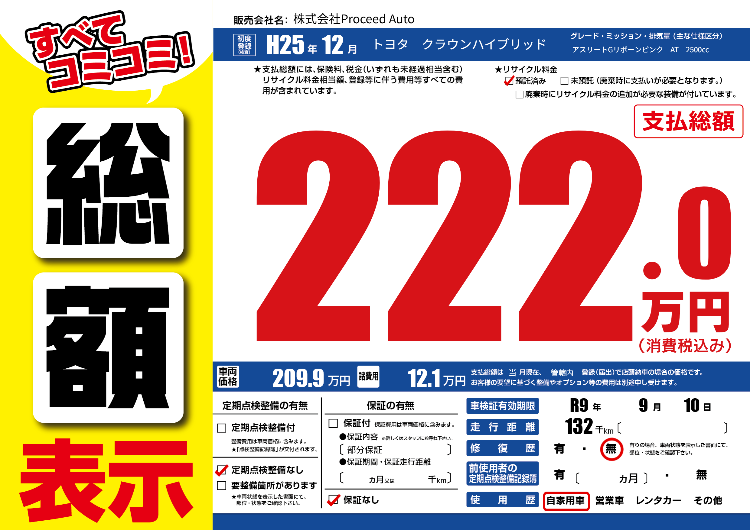 | 車名 | トヨタ クラウンハイブリッド | グレード ミッション 排気量 |