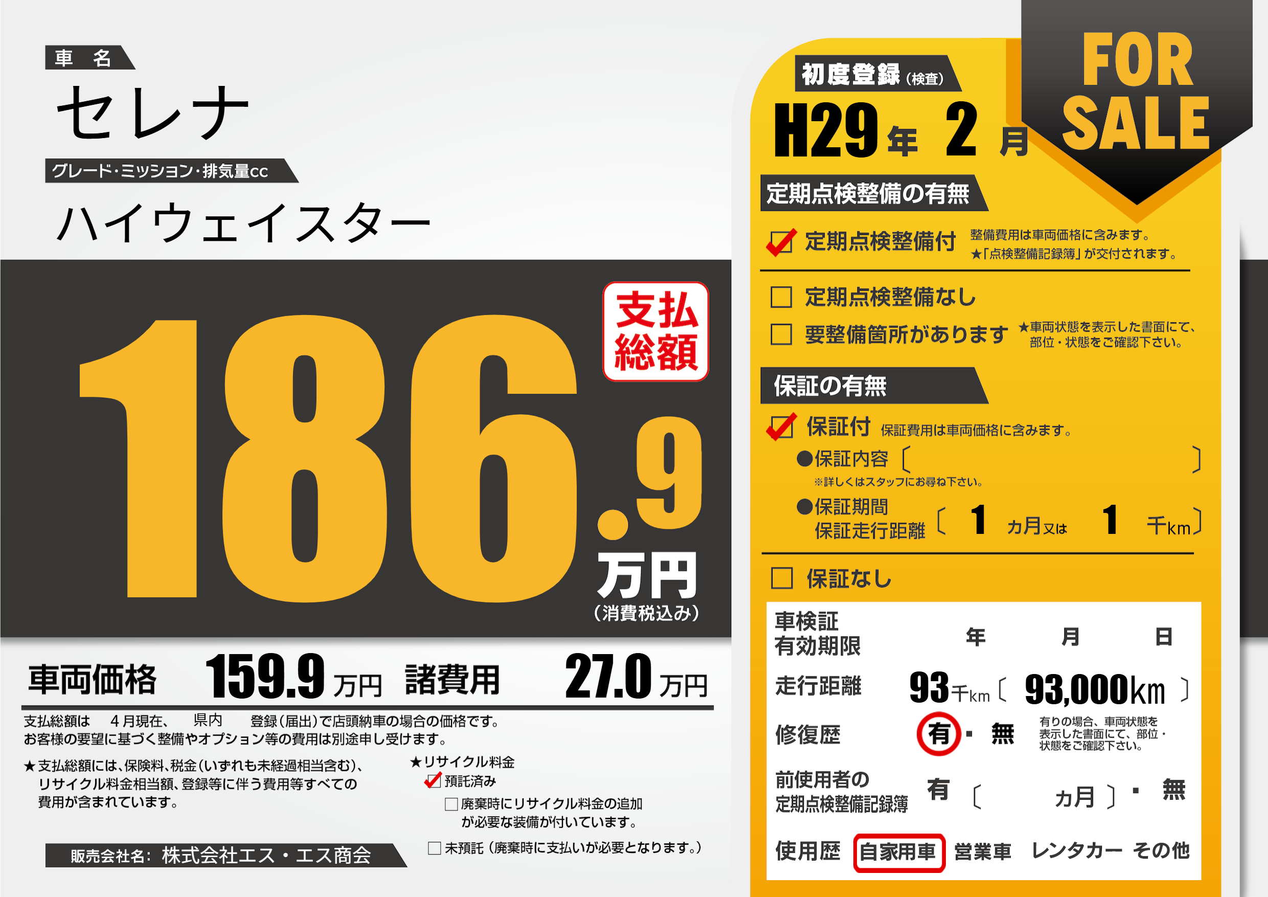 | 走行キロ | 9.3万km | 初年度登録 | H29年2月 |