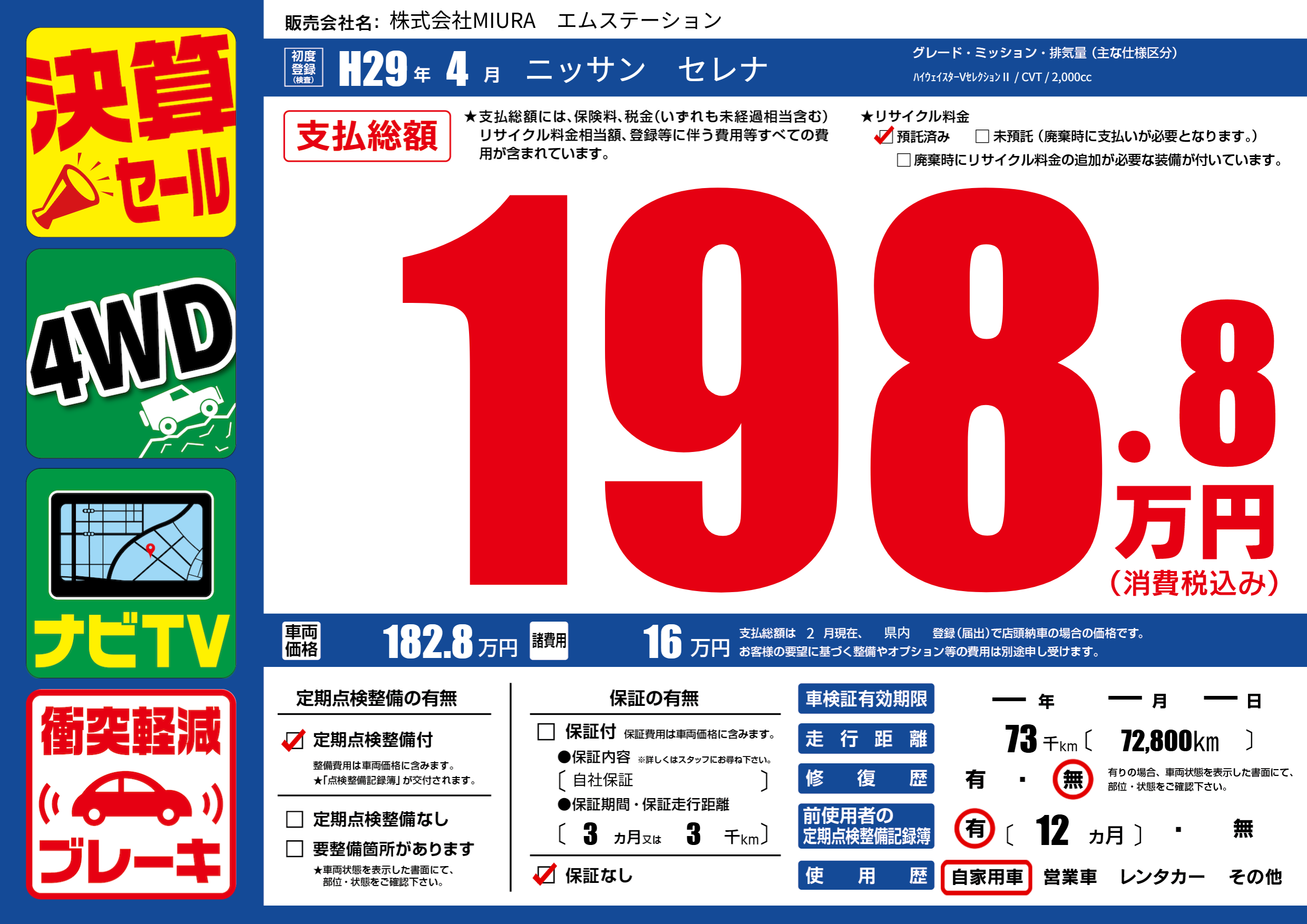 | 車名 | ニッサン セレナ | グレード ミッション 排気量 |