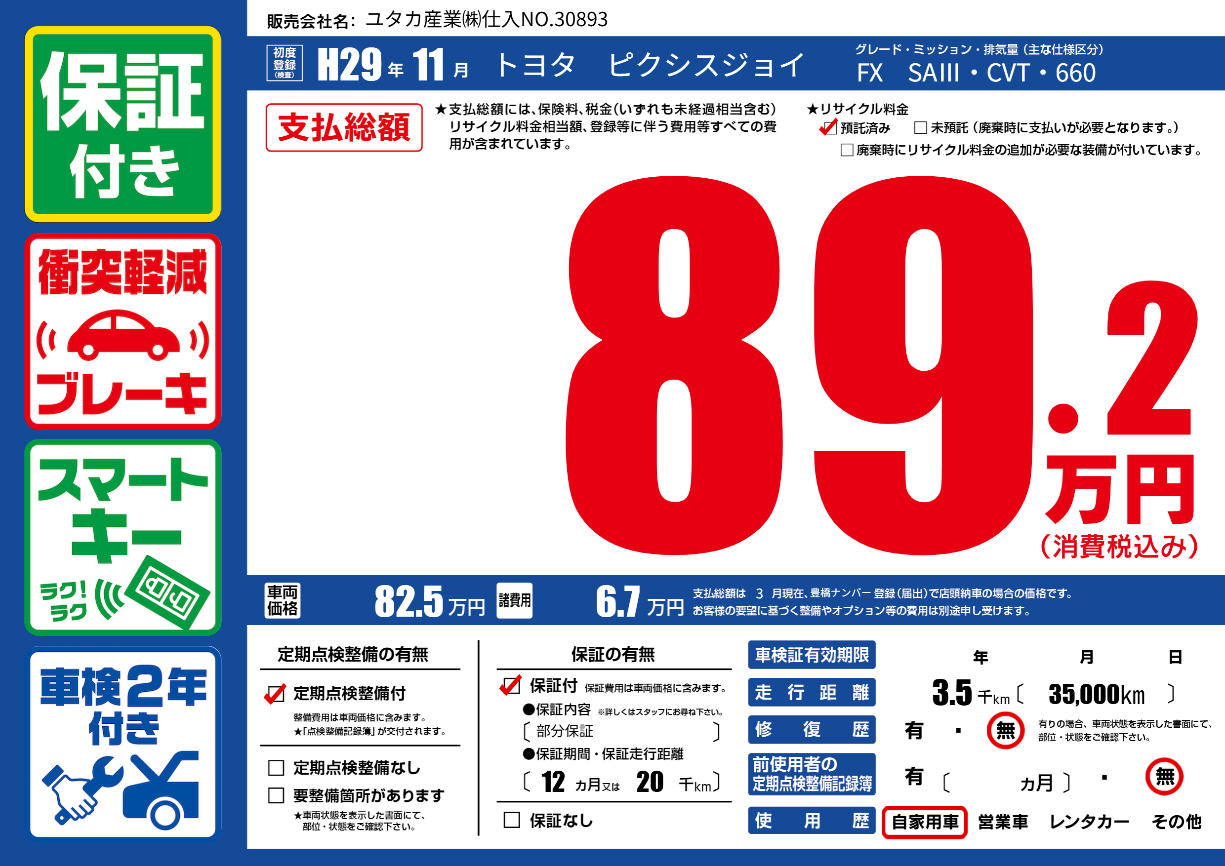 保証付き 保証内容(部分保証) 12ヶ月または(20)千kmまで |