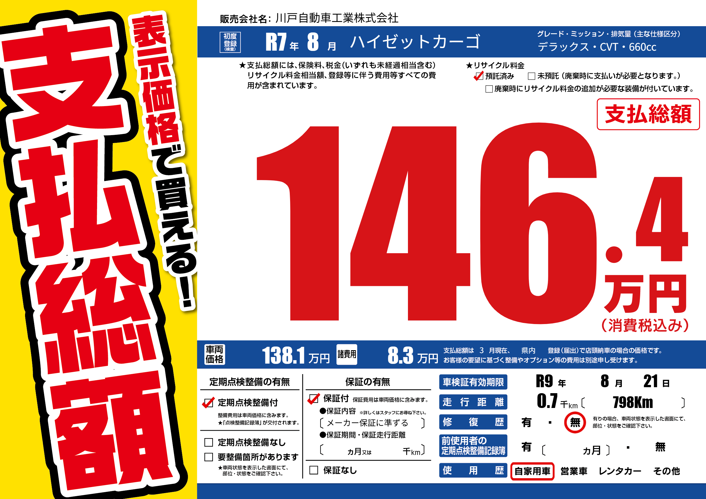 | 車名 | ハイゼットカーゴ | グレード ミッション 排気量 |
