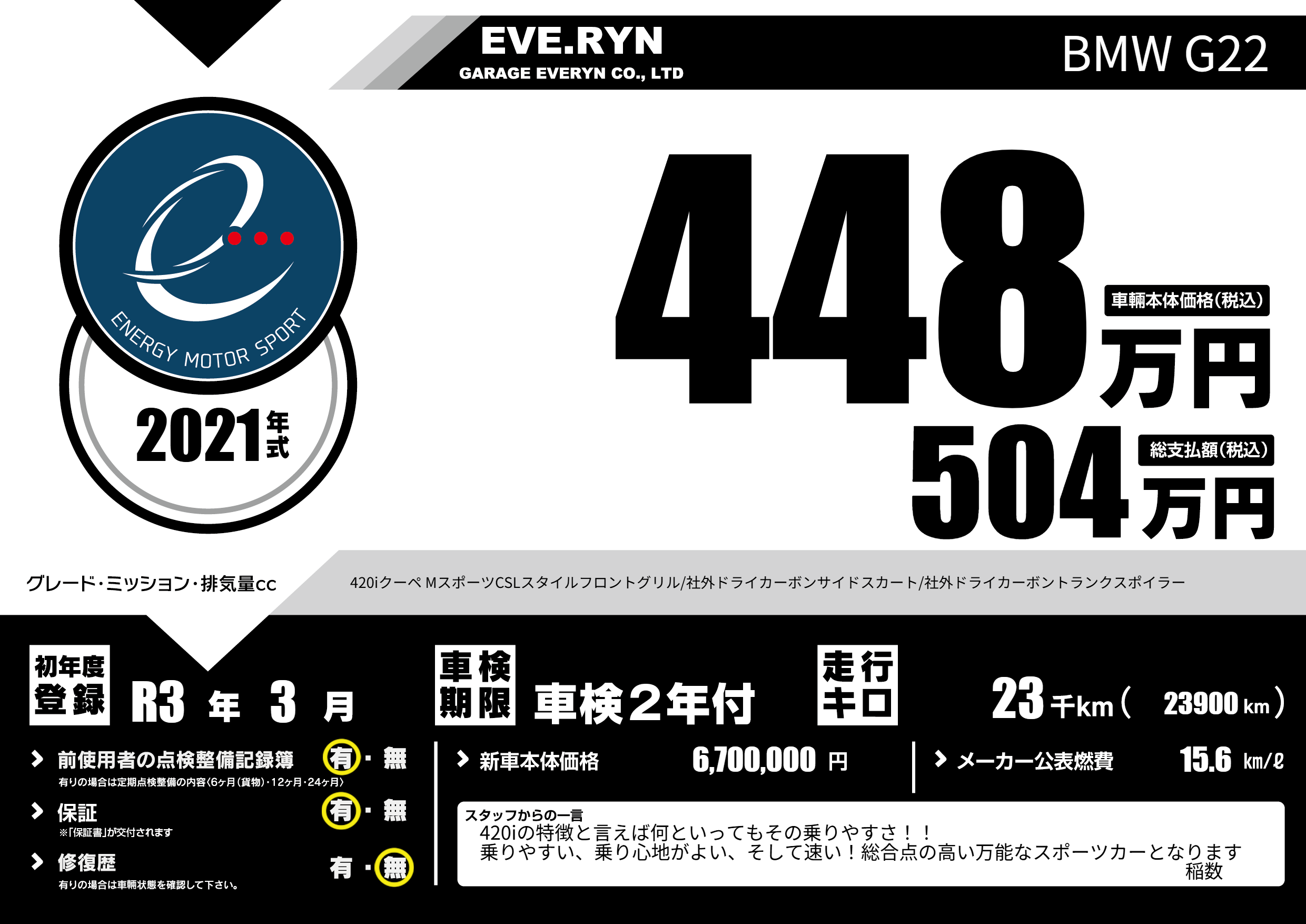 | 車名 | BMW G22 | グレード ミッション 排気量 |