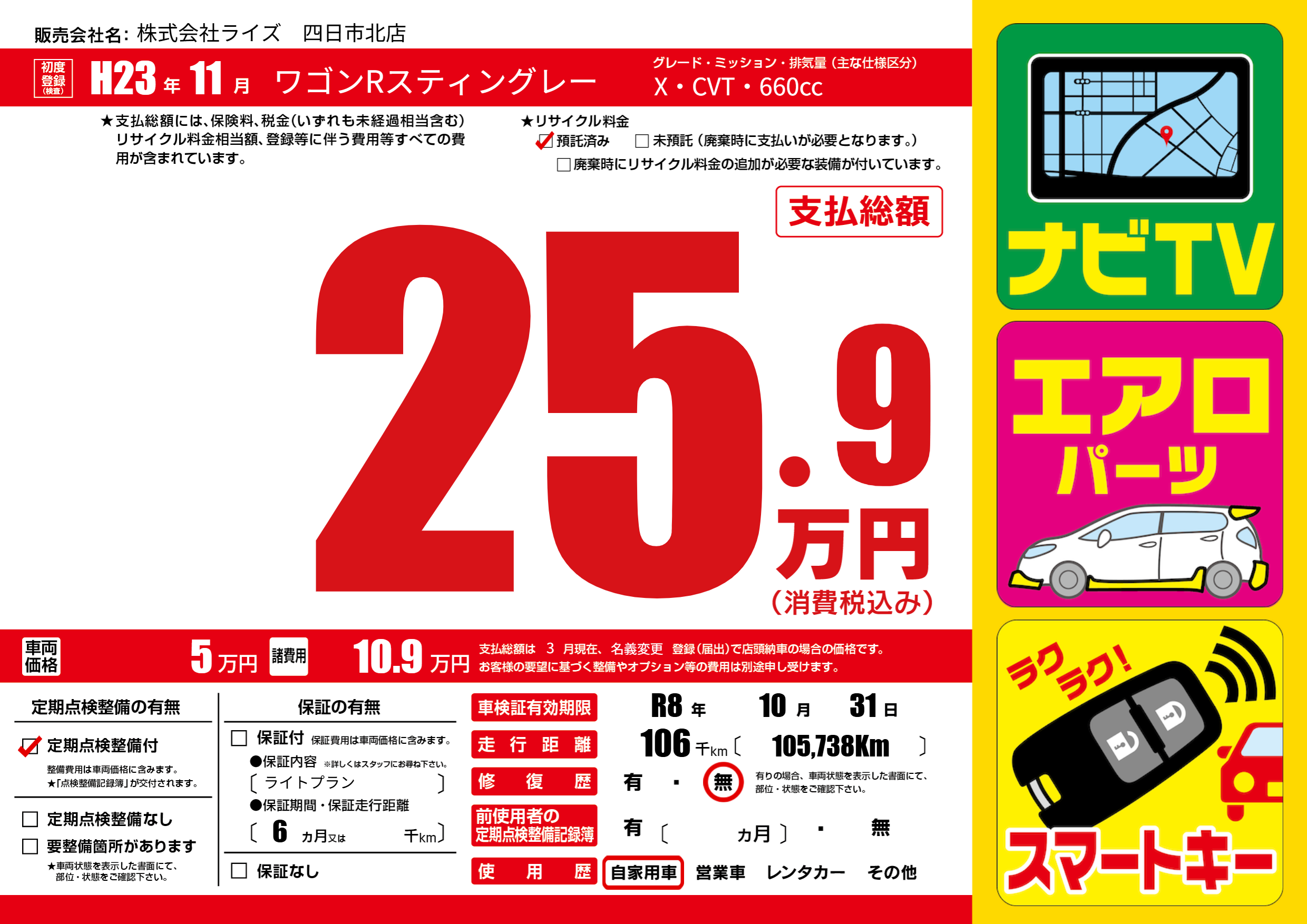 | 走行キロ | 10.6万km | 初年度登録 | H23年11月 |
