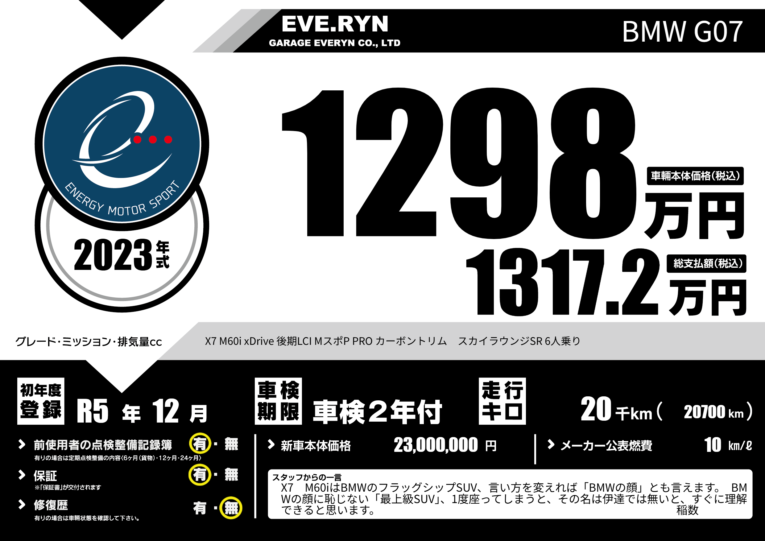 | 車名 | BMW G07 | グレード ミッション 排気量 |