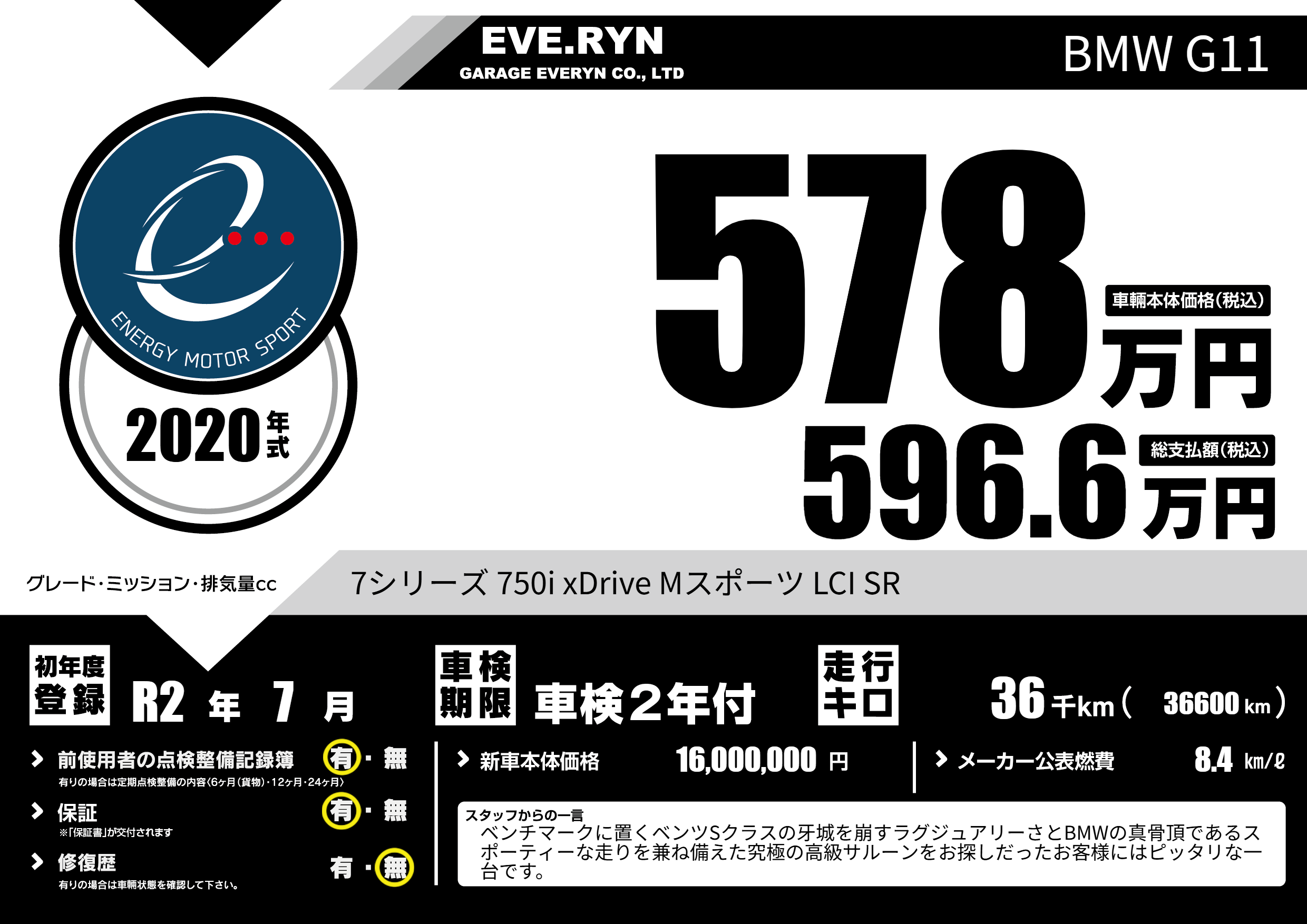 | 車名 | BMW G11 | グレード ミッション 排気量 |