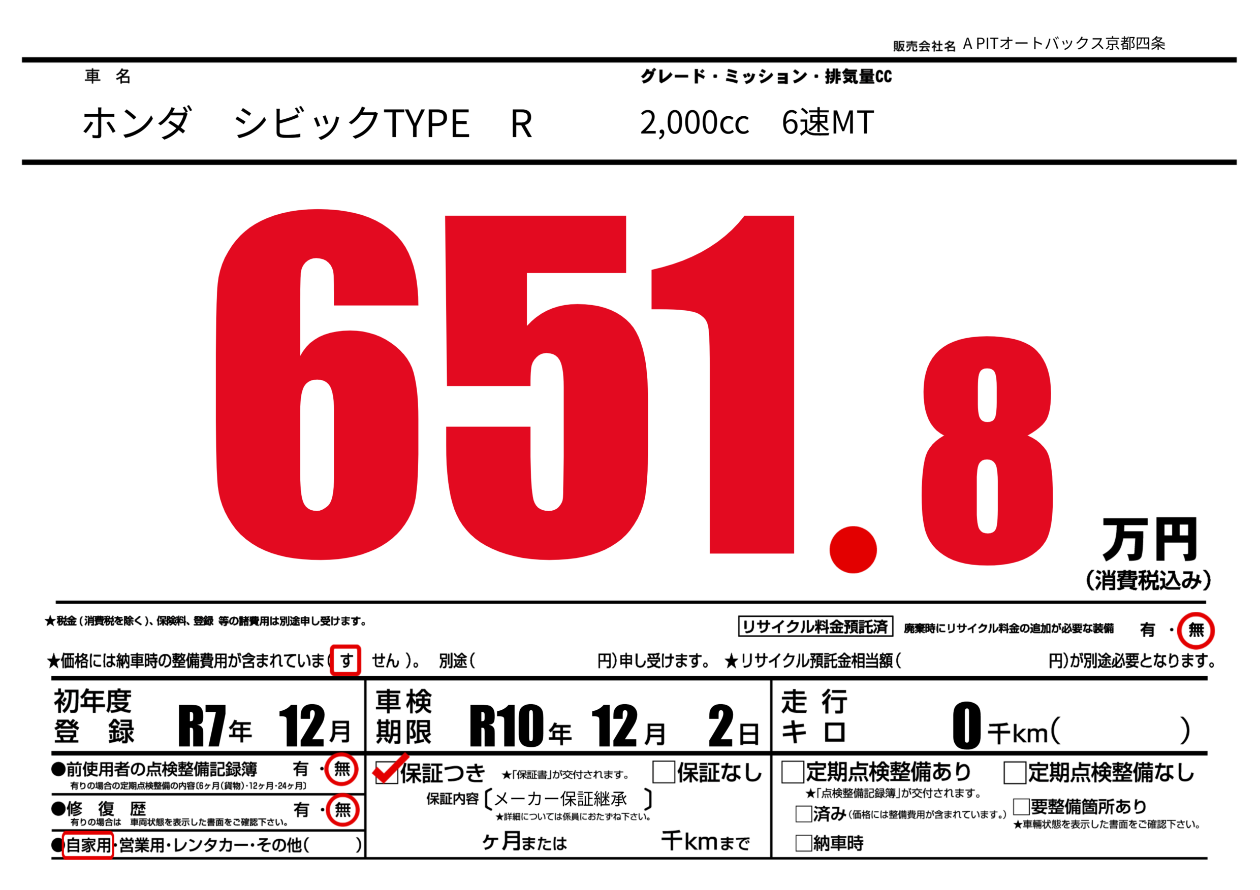 保証なし 保証内容(メーカー保証継承) ---ヶ月または()千kmまで |