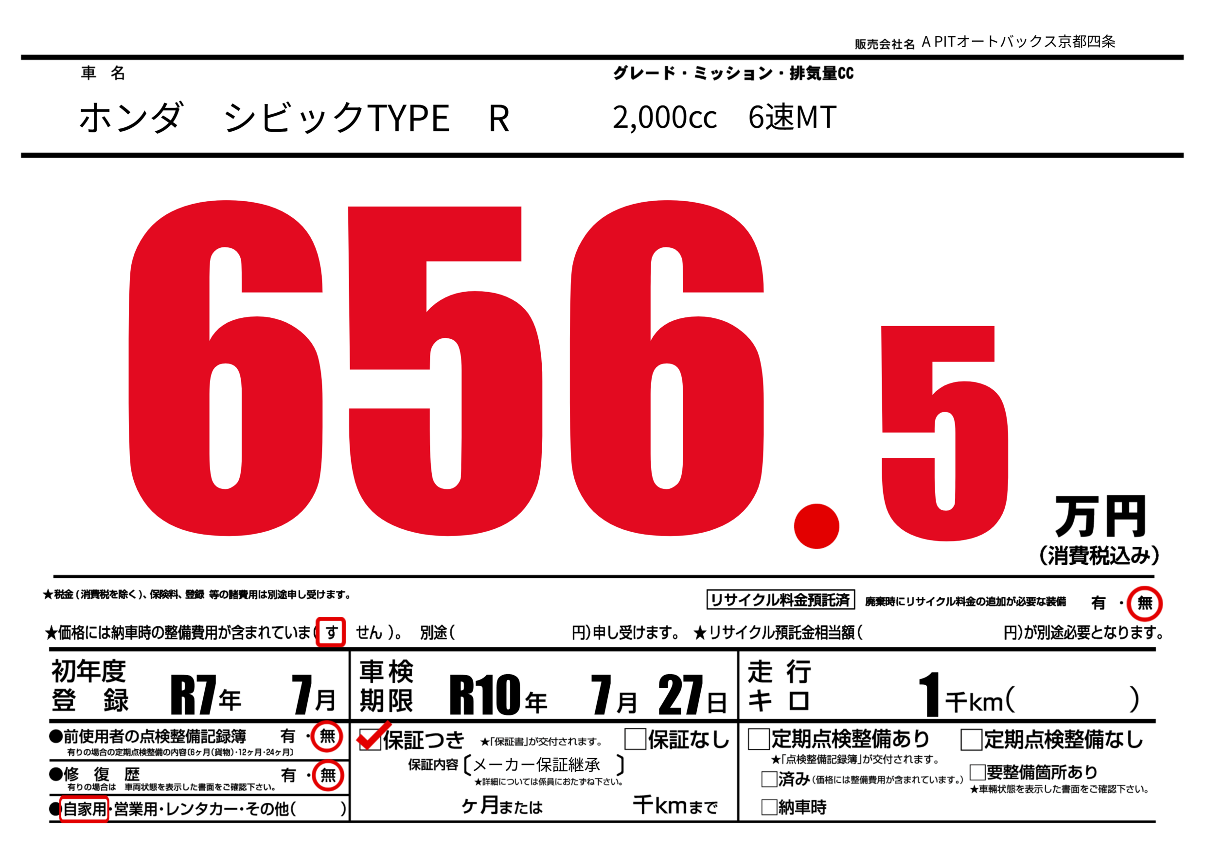 | 車検制限 | R10年 7月 27日 | ||