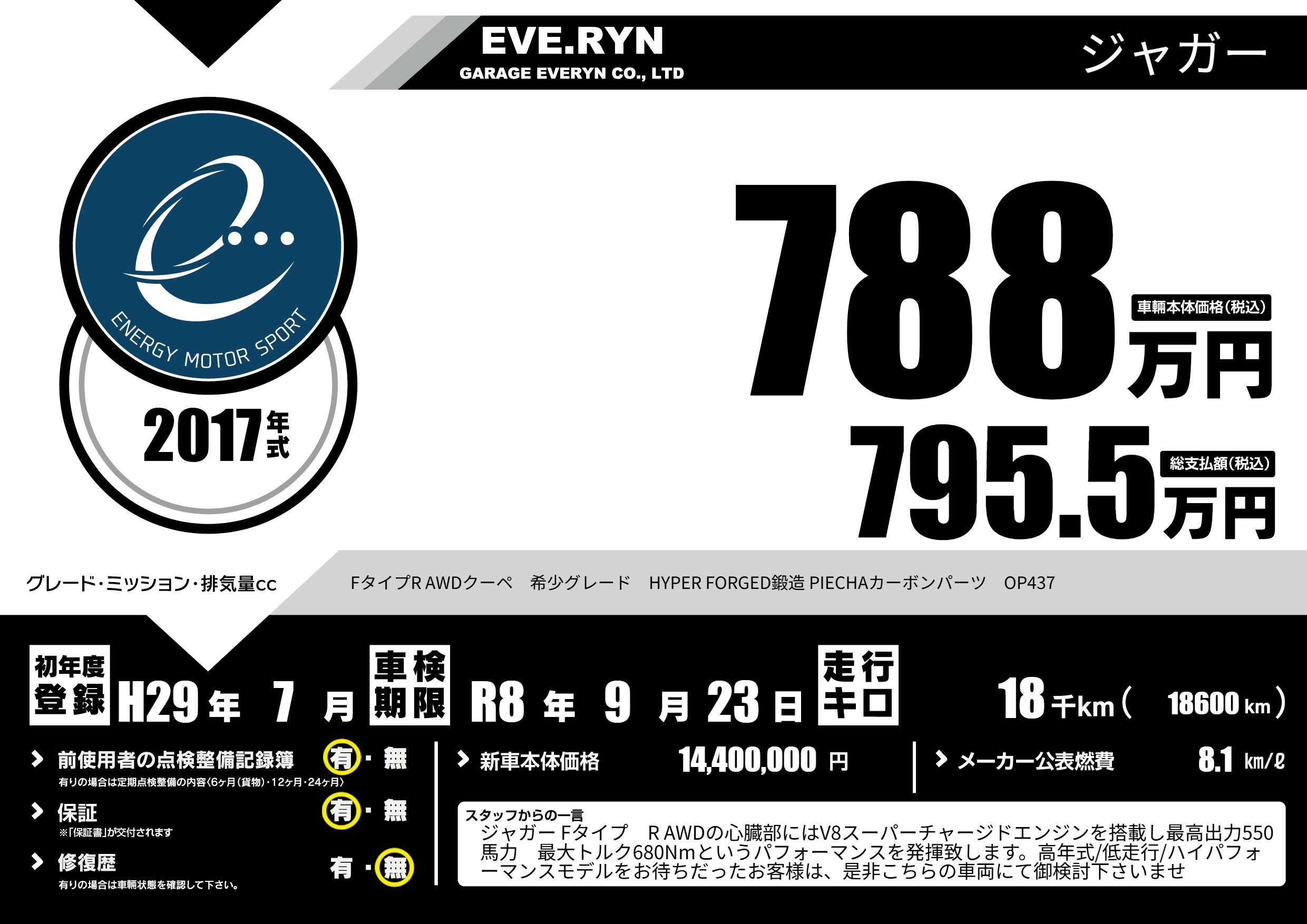 FタイプR AWDクーペ 希少グレード HYPER FORGED鍛造 PIECHAカーボンパーツ OP437 |