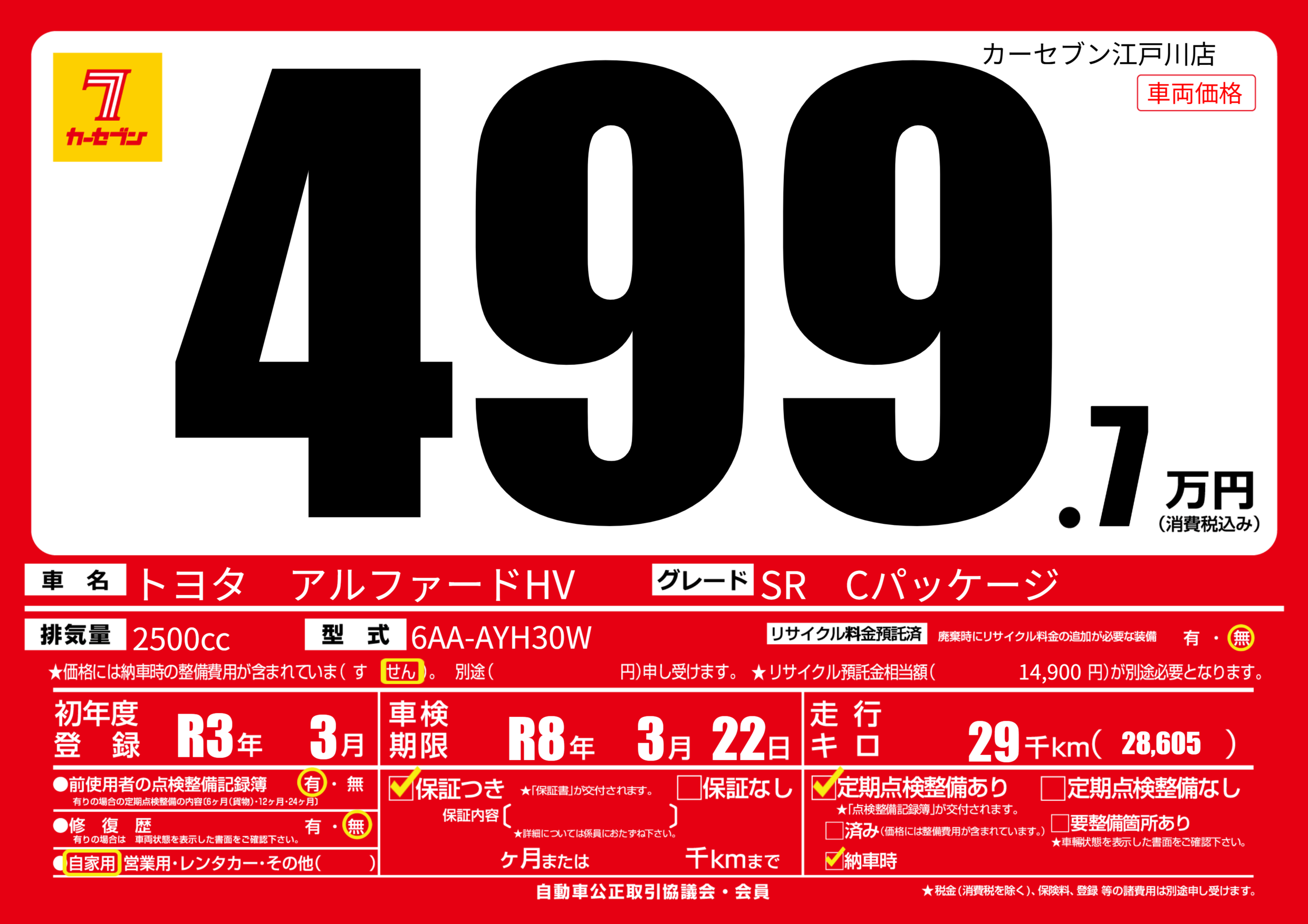 | 車名 | トヨタ アルファードHV | グレード ミッション 排気量 |