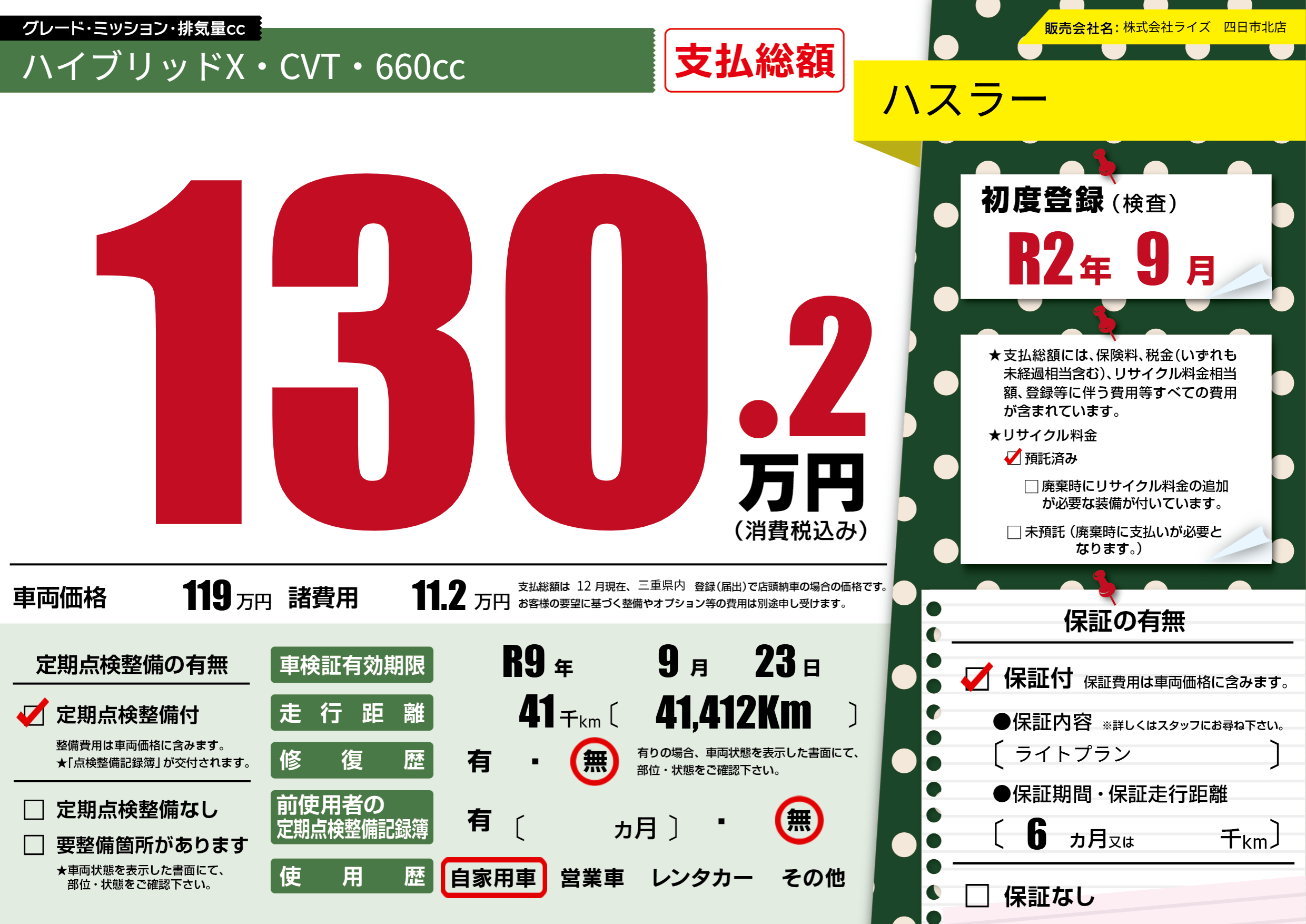 なし | 車検制限 | R9年9月23月 |