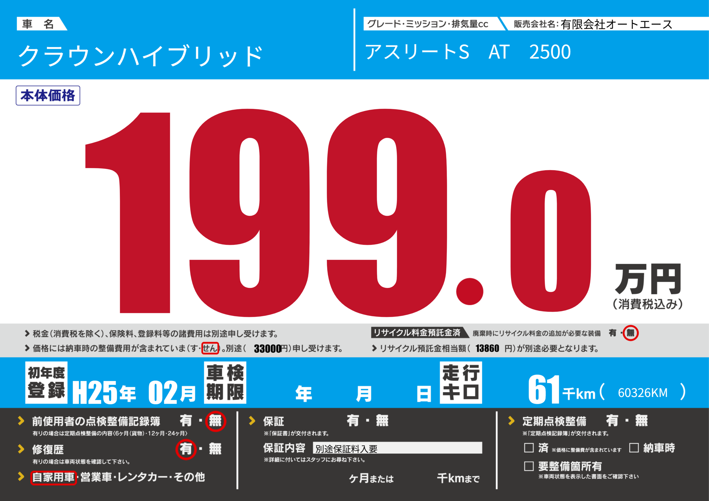 | 車名 | クラウンハイブリッド | グレード ミッション 排気量 |