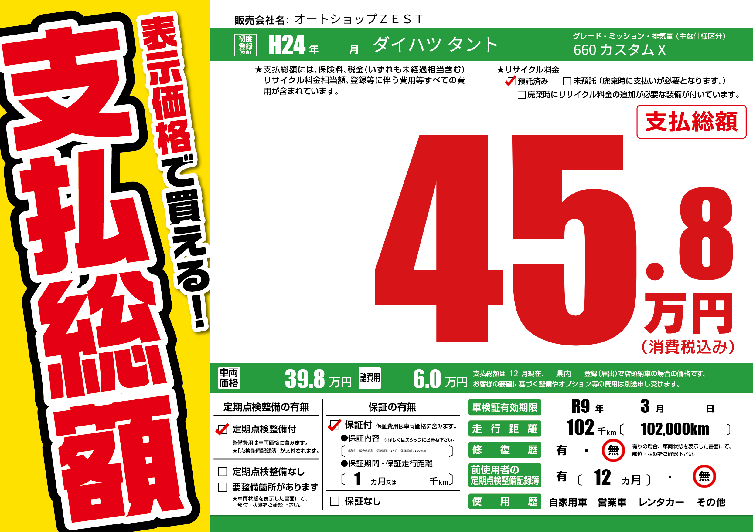 保証なし 保証内容(保証付:販売店保証 保証期間:1ヵ月 保証距離:1,000km) 1ヶ月または()千kmまで |