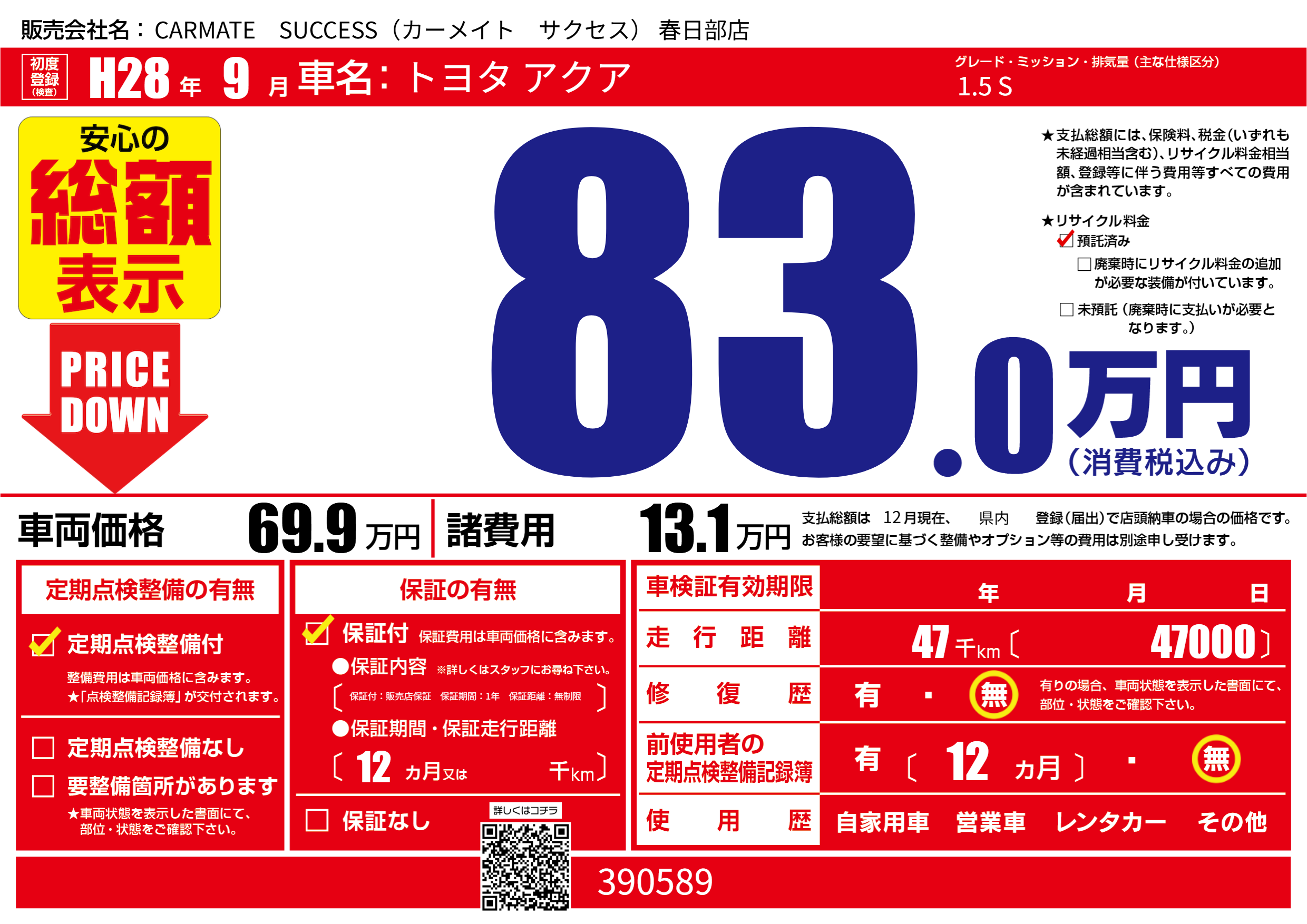 | 走行キロ | 4.7万km | 初年度登録 | H28年9月 |