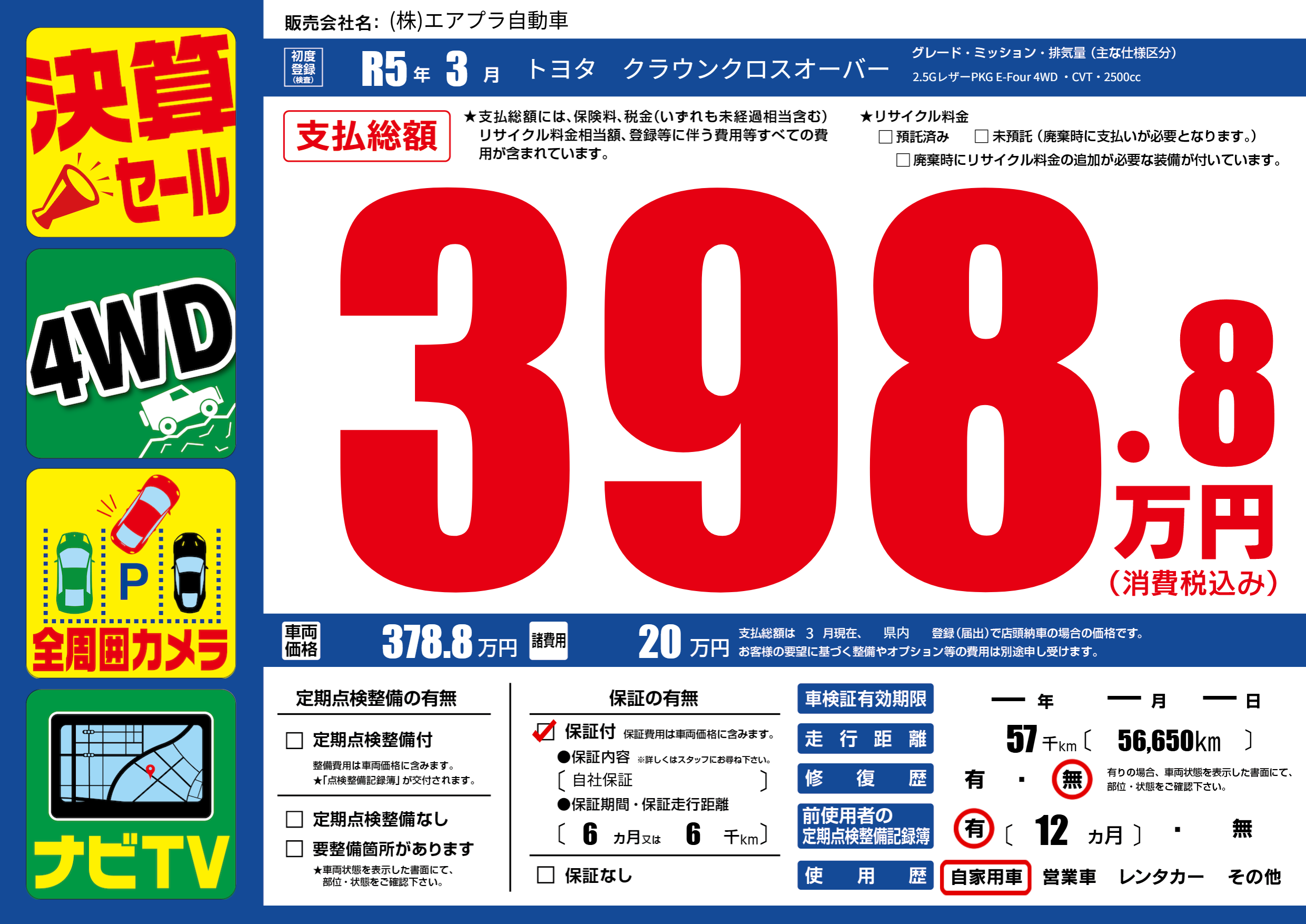 保証付き 保証内容(自社保証) 6ヶ月または(6)千kmまで |