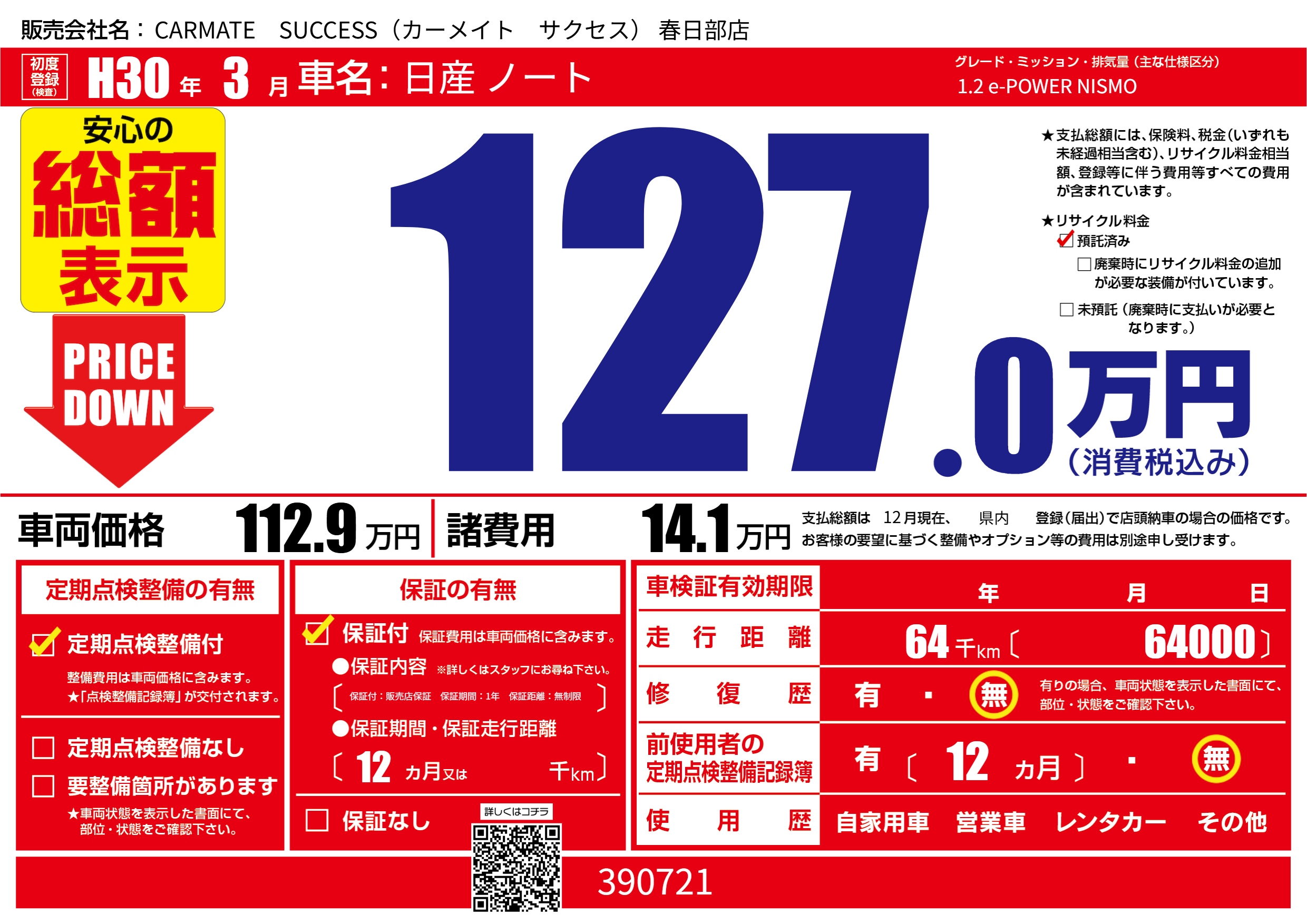| 車名 | 日産 ノート | グレード ミッション 排気量 |