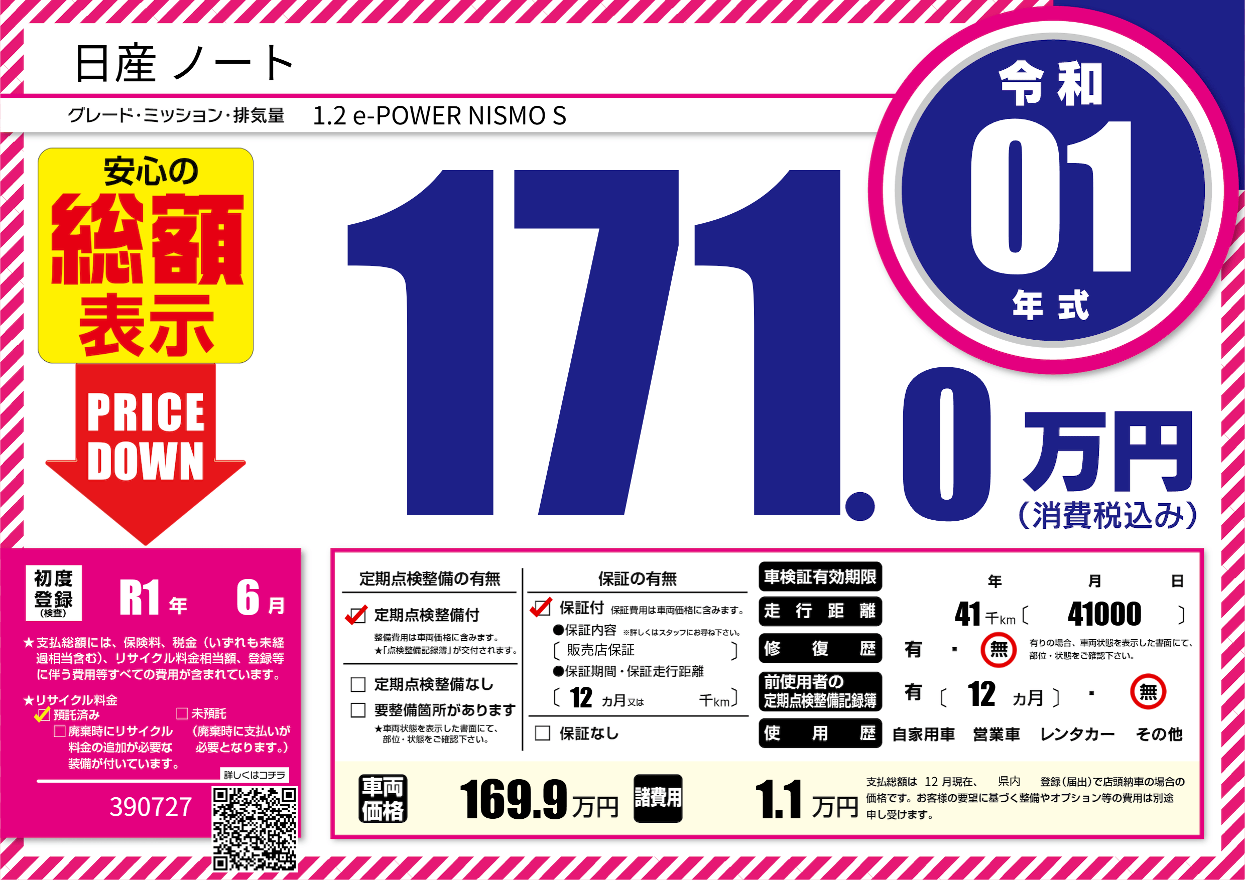 | 車名 | 日産 ノート | グレード ミッション 排気量 |