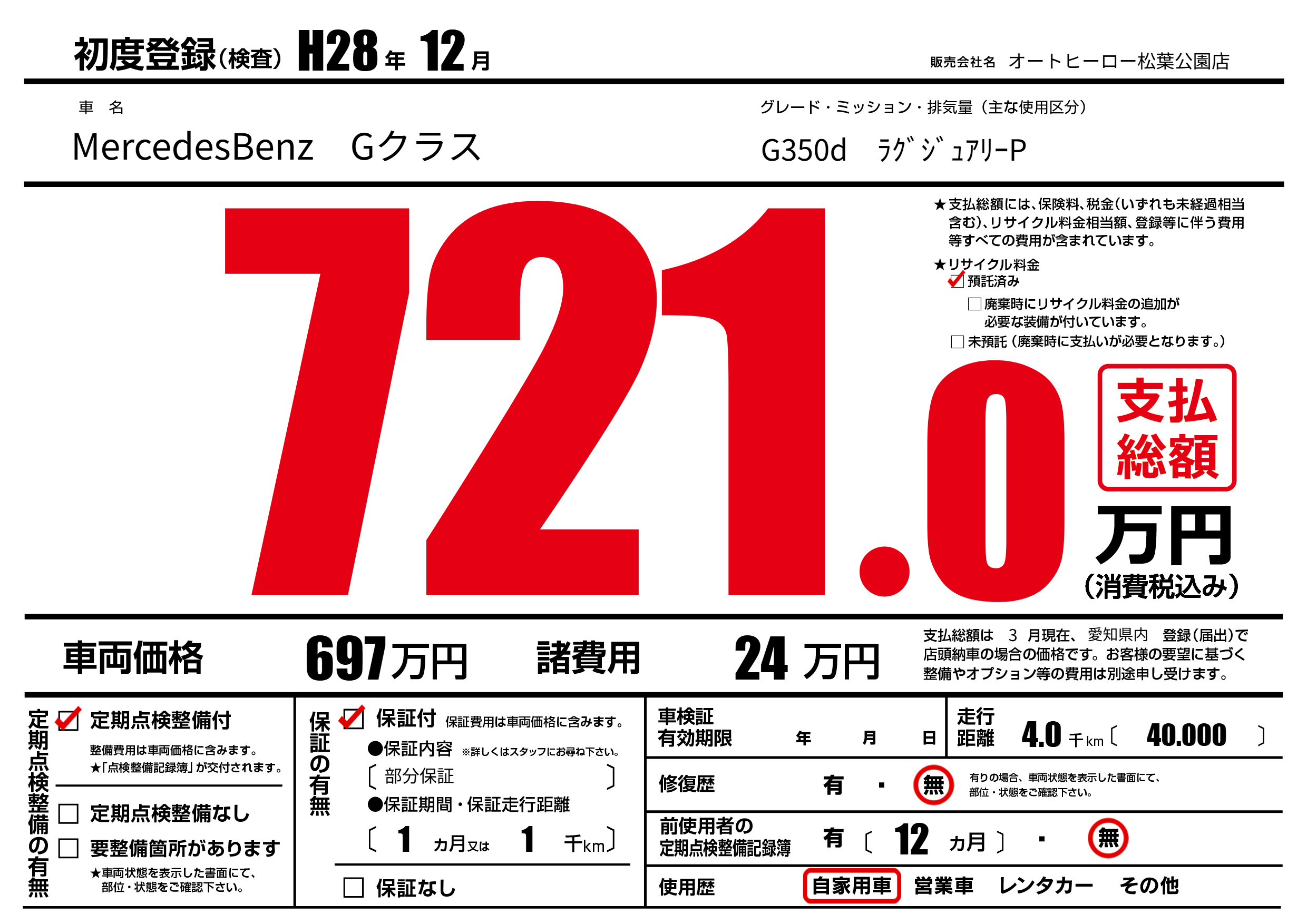 | 走行キロ | 0.4万km | 初年度登録 | H28年12月 |