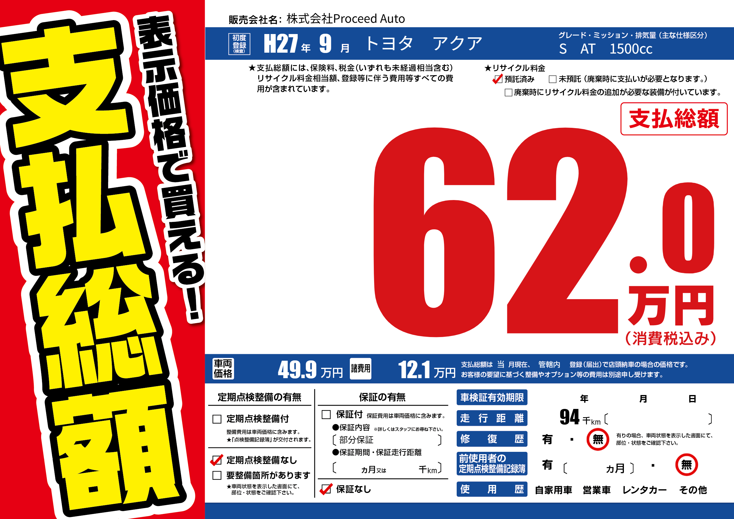 保証なし 保証内容(部分保証) ---ヶ月または()千kmまで |