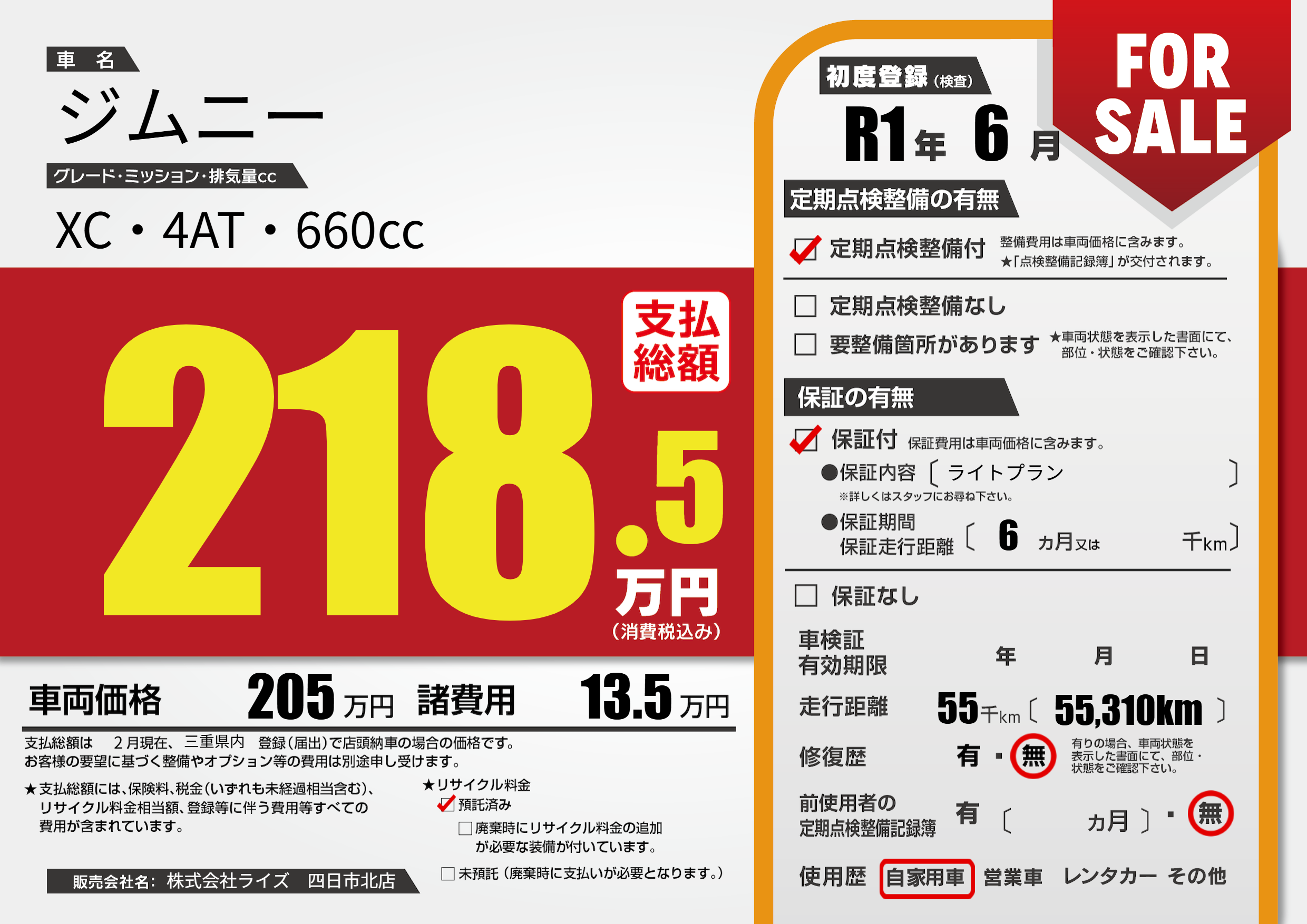 保証付き 保証内容(ライトプラン) 6ヶ月または千km |