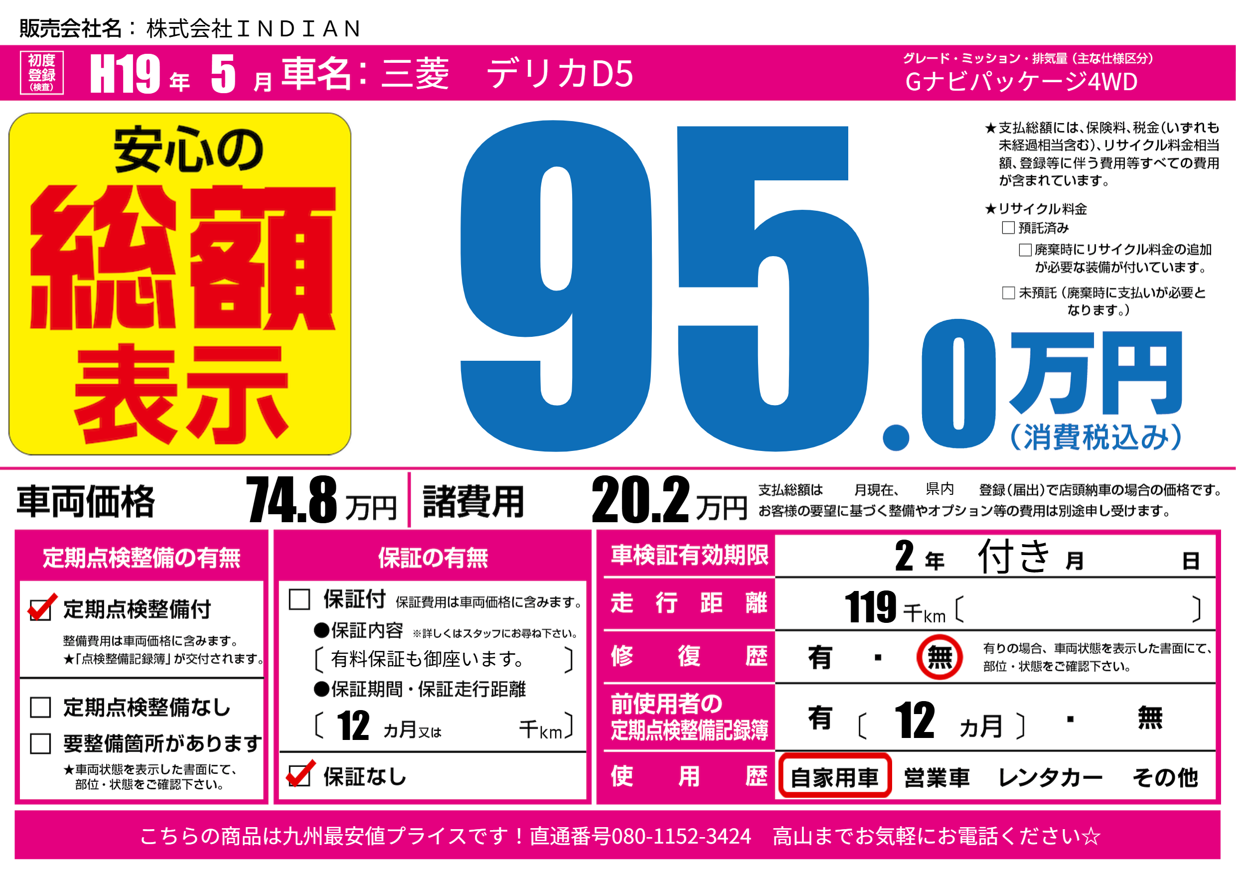 | 走行キロ | 11.9万km | 初年度登録 | H19年5月 |
