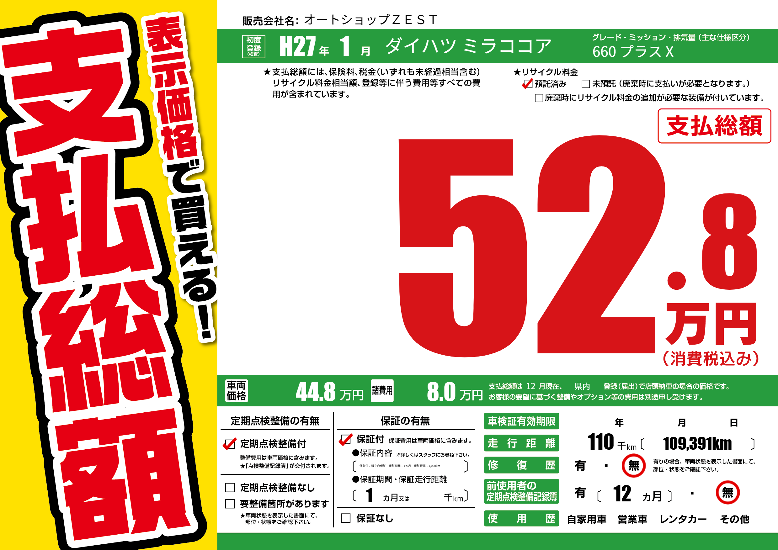| 走行キロ | 11万km | 初年度登録 | H27年1月 |