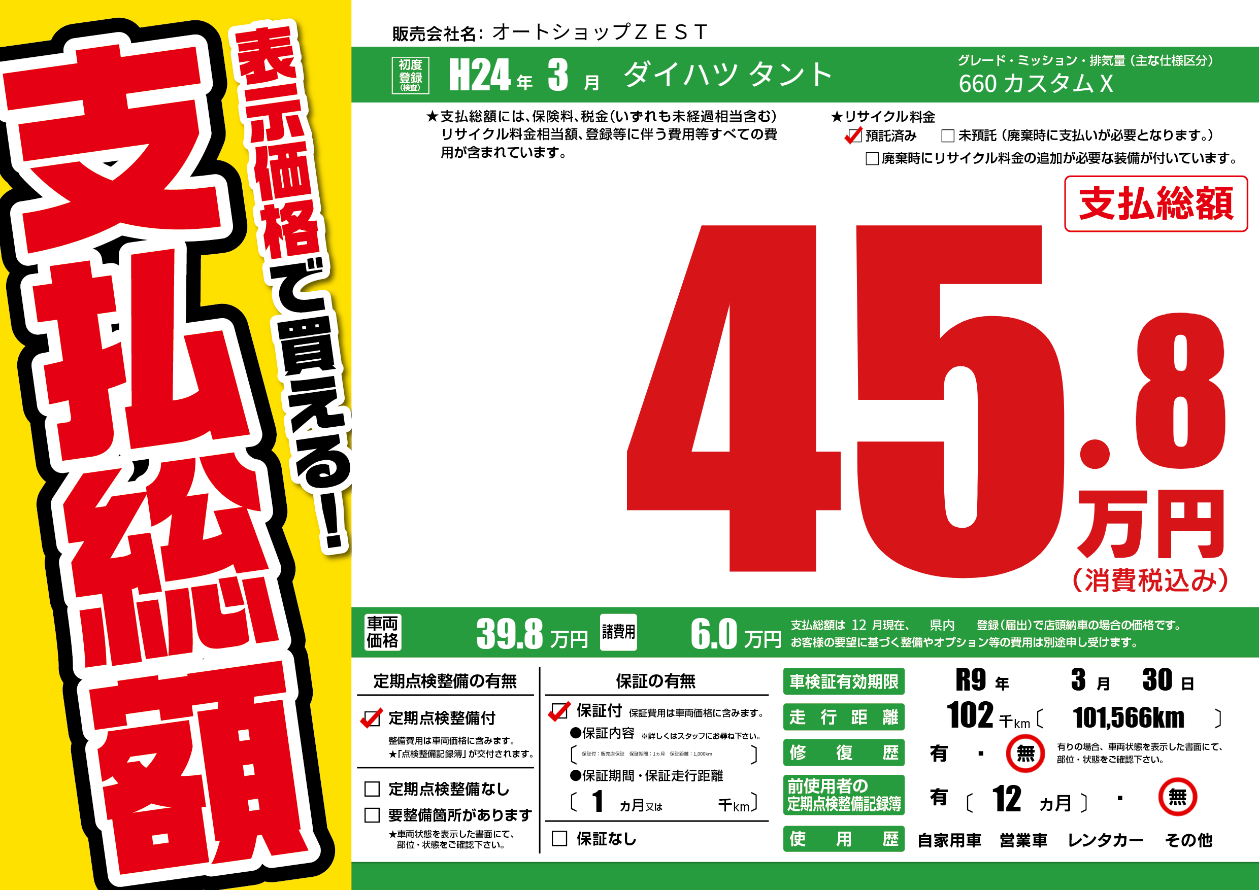 保証なし 保証内容(保証付:販売店保証 保証期間:1ヵ月 保証距離:1,000km) 1ヶ月または()千kmまで |